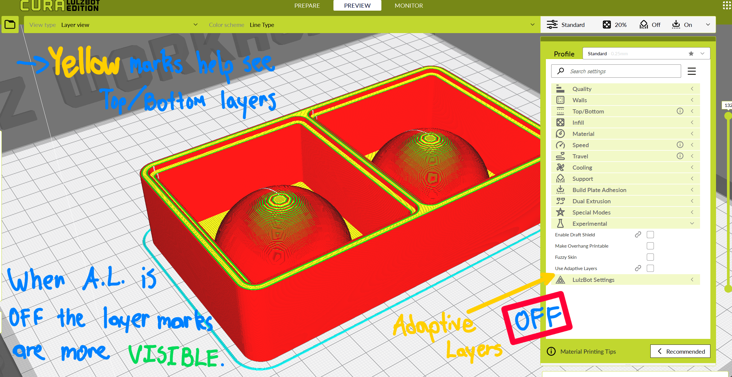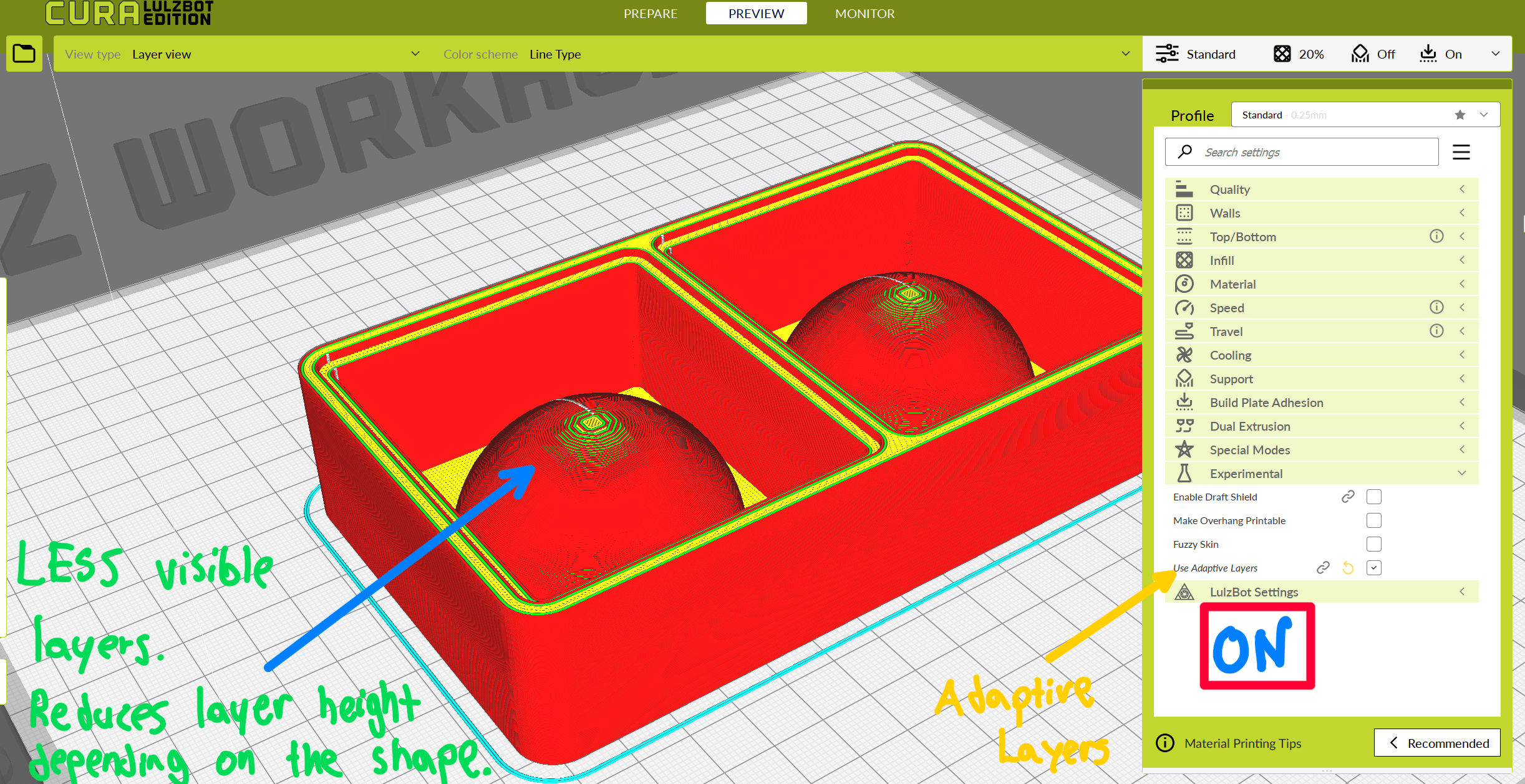 To create this mold, I’ll be using my LulzBot TAZ Workhorse. To have better results on the quality of the print we need decrease the normal height of the layer but in my case CURA LulzBot edition no longer supports an “HD” profile and just changing the layer heights wont help. Changing the layer heights also involves calibrating more parameter to properly print the part. To solve this problem the setting “ Adaptive Layer Height” comes into hand (it’s considered experimental so I had to turn it ON in the advanced settings).