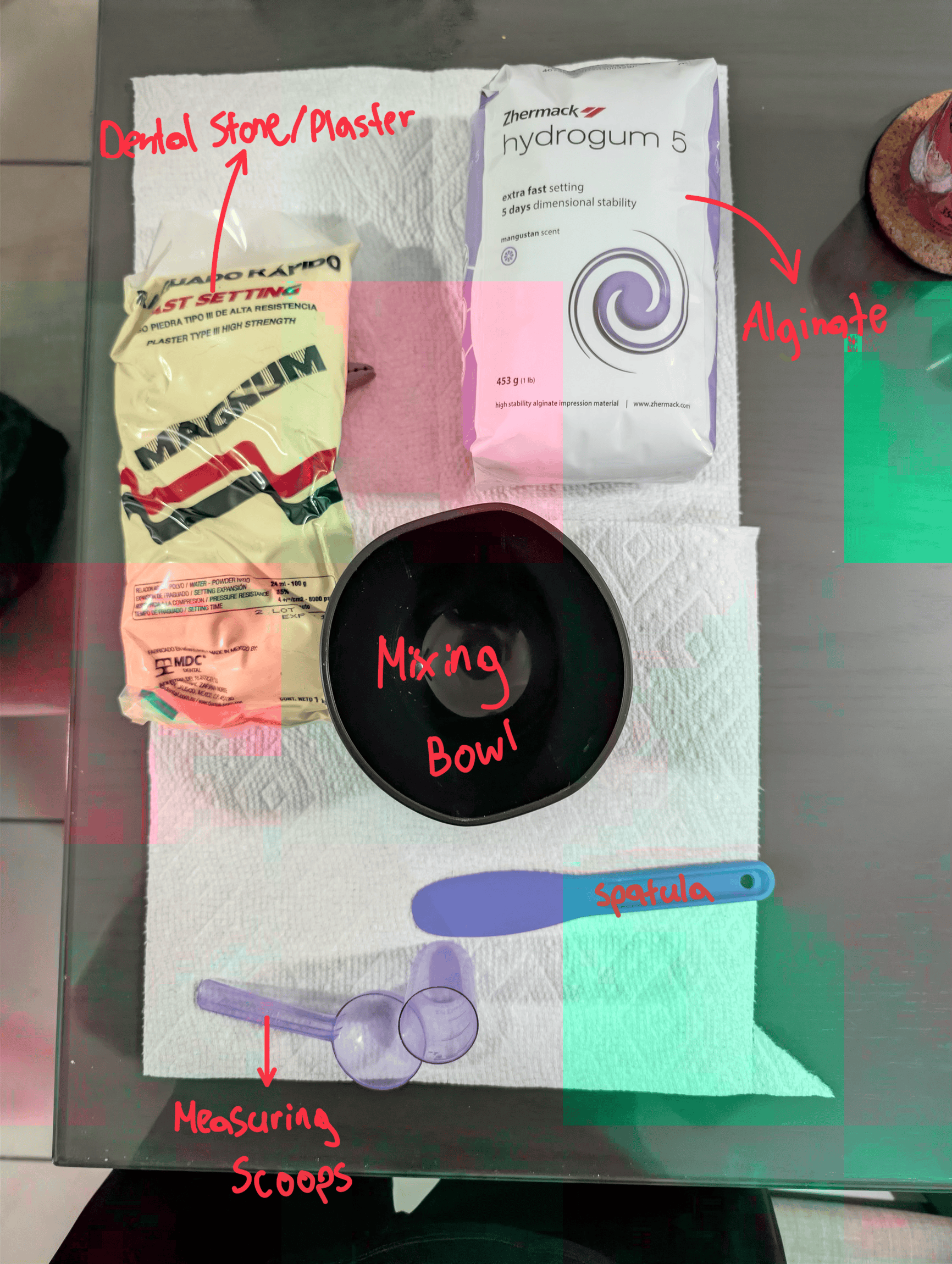 In Honduras it was easier to get dental impression and casting supplies. Long story short that’s the reason I’m using Alginate and Dental Stone/Plaster. My “brother from another mother” (Luis) and his girlfriend (Sam) are amazing dentists and helped me make this assignment possible in a short period of time. Both materials are really safe to use but always be carful with you eyes and always wash your hands when you’re done. Here is a breakdown of the specific items: