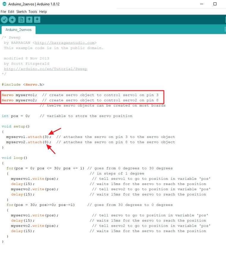 To do this, I used the built-in code in arduino ide and add the second servo as myservo 2.