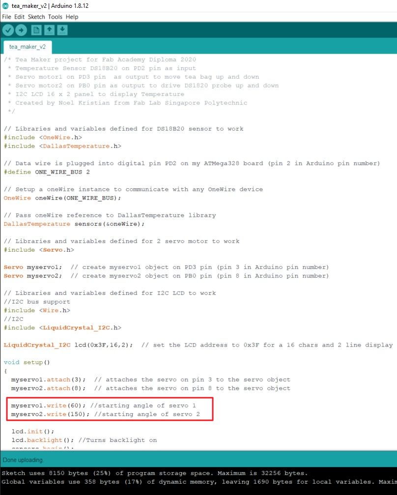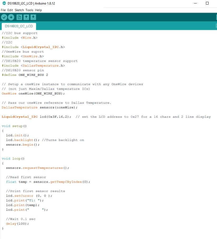 In order for this code to work, several libraries such as "one wire", "dallas temperature" and liquidcrystal_I2C" must be downloaded. How to do this can be seen in exercise 9, Input Devices page and exercise 11, Output Devices page.
