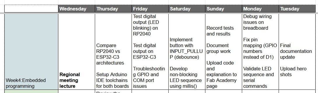 During Week 4 (Embedded Programming), my teammate Carmen and the team organized ourselves to demonstrate and compare toolchains and development workflows across different microcontroller families. To divide the work, each member focused on one microcontroller. In my case, I documented the RP2040, and then shared my findings so we could compare them with the other architectures selected by the group.