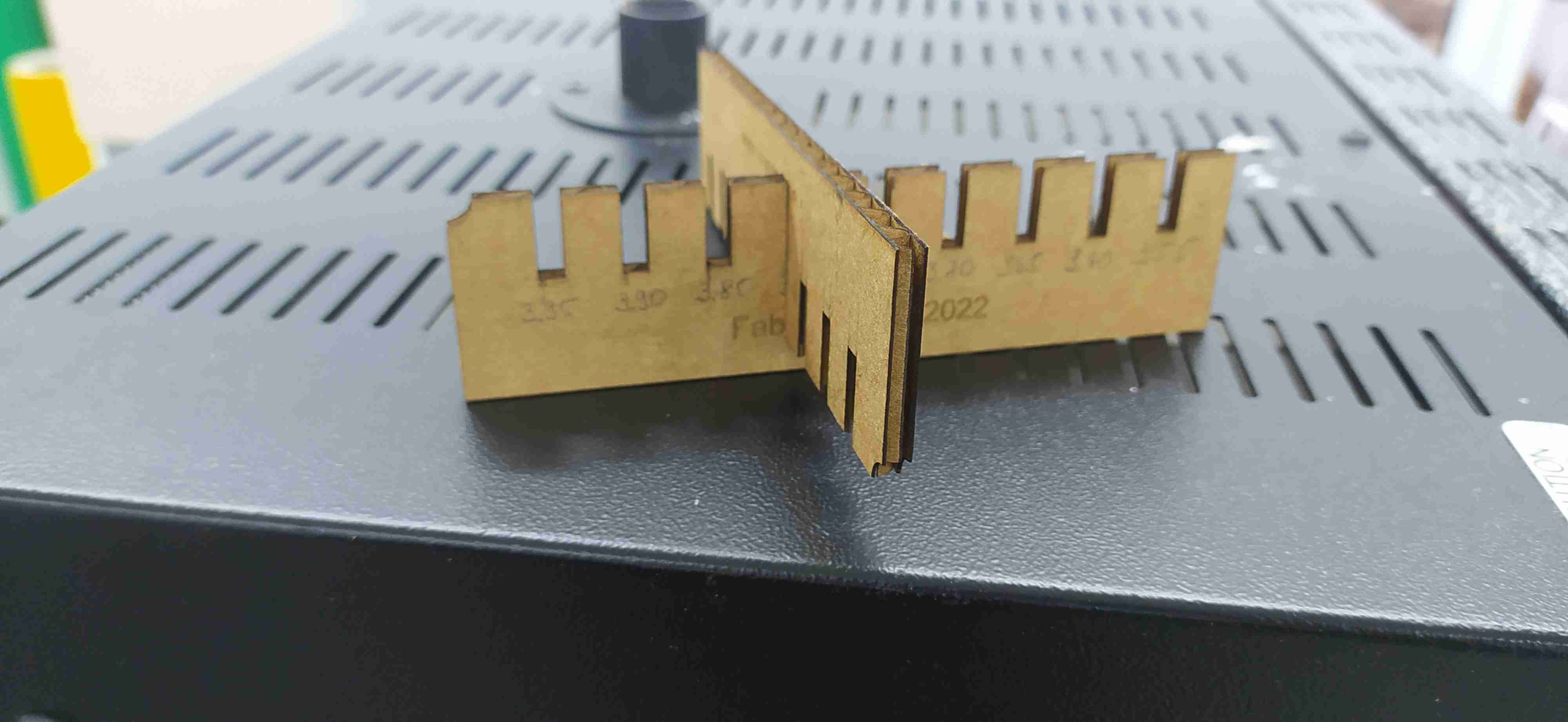 For finding the laser cutter Kerf, we have cut two squares from cardboard. One was 15mm x 15mm, and one was 10mm x 10mm. Then we measured these with a micrometer. The micrometer is a device for measuring very small objects, so it is a very precise tool. But before cutting, we focused laser and made some tests on cardboard to find the best values for speed, power and rate.