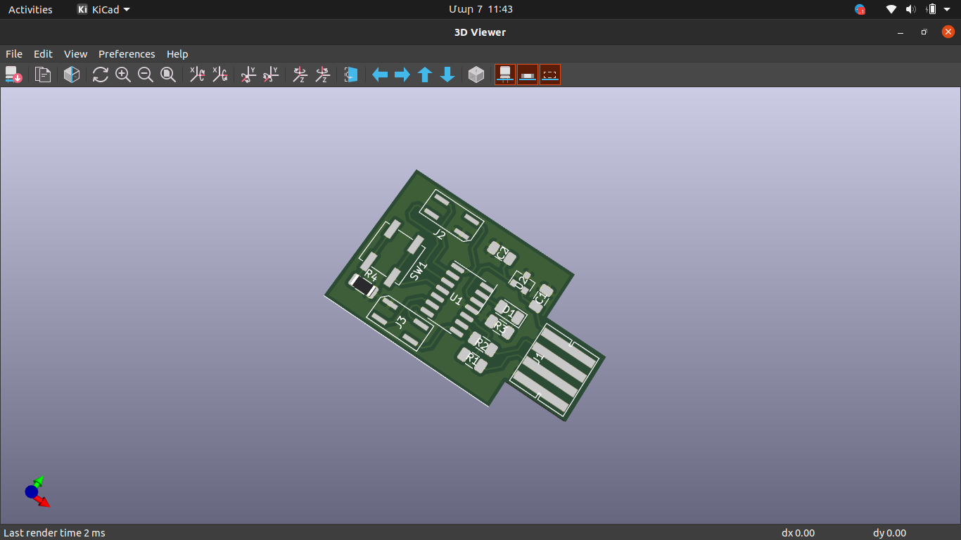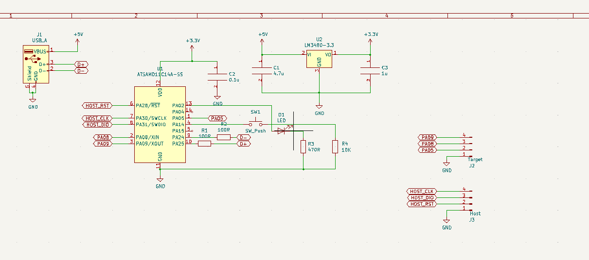 This week I was working on the hello-world board. As I have already designed a programmer with samd11c, I just modified that design and added a led and a button. I also used the connector for the target board to have tree input/output pins.