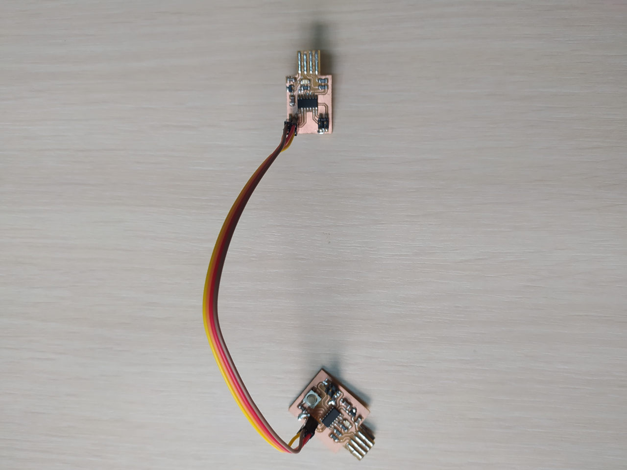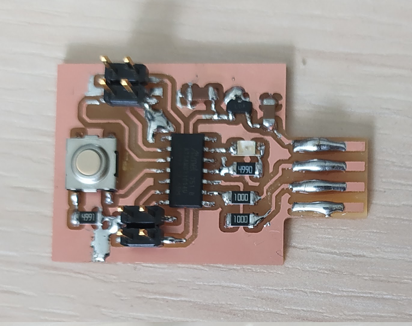 The first try was a failure because I forgot to set minimal track clearance, so the tracks for USB and a button were connected. I changed the design a little bit and tried one more time. The second try was successful. Having PCB cut, I assembled it.