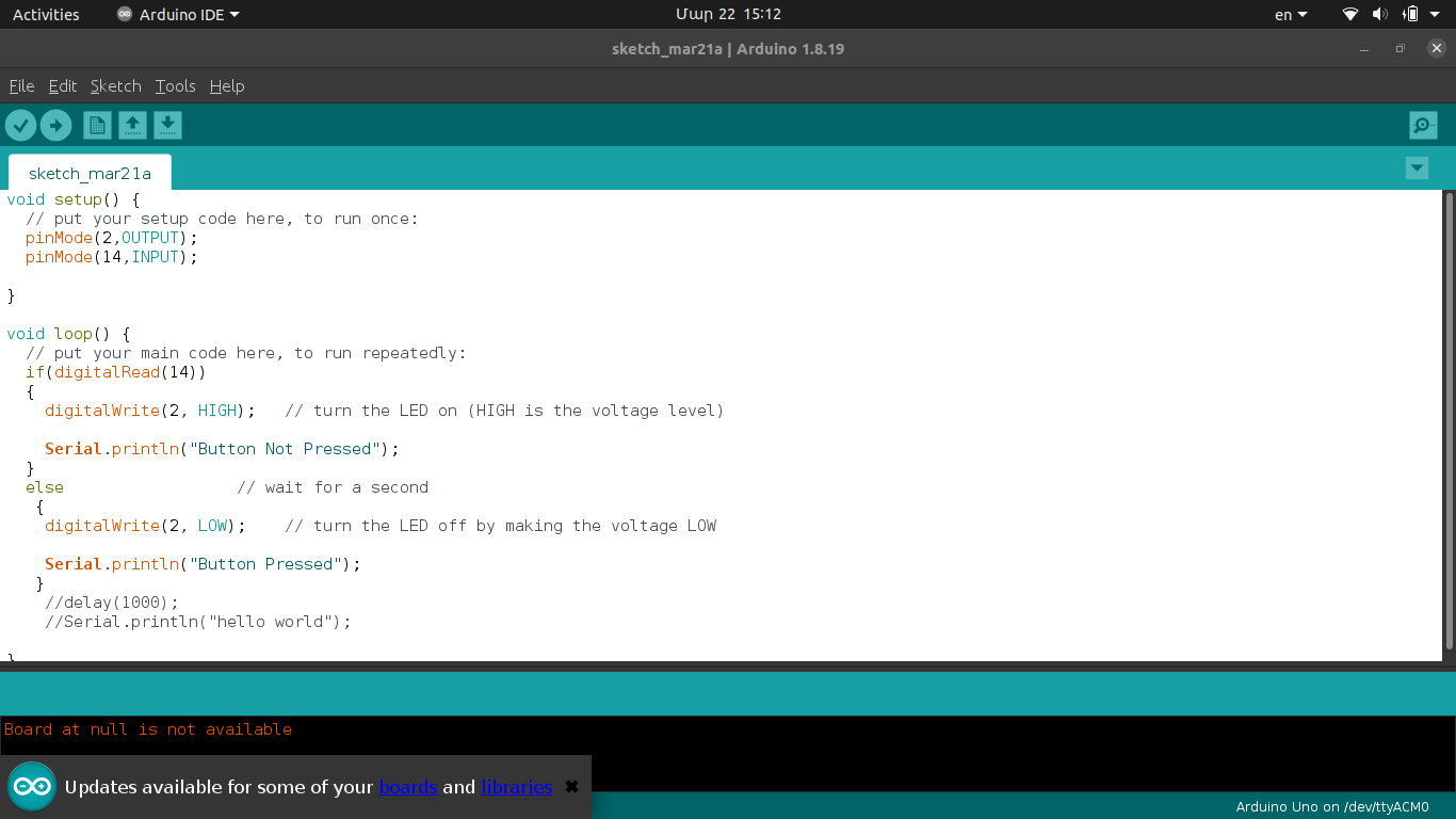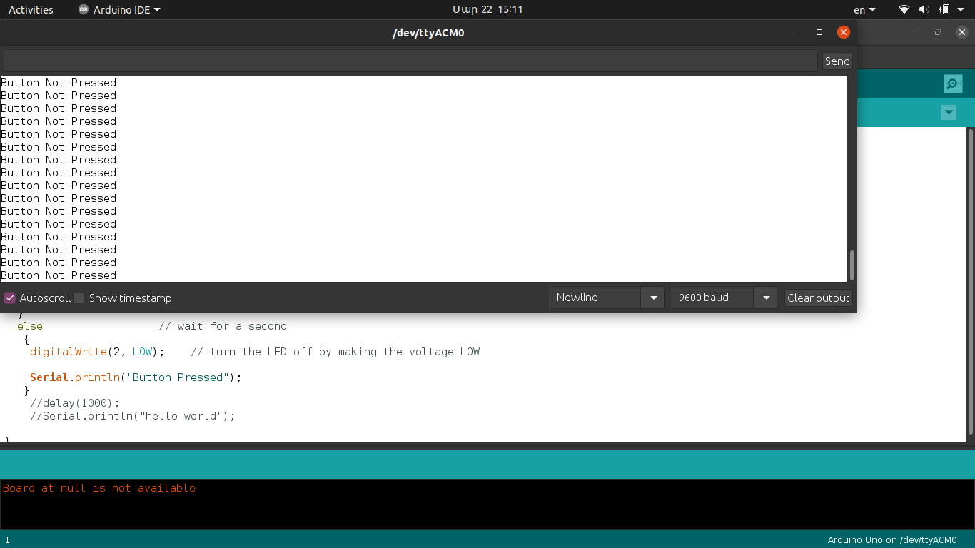 I wrote a simple program that turns on led and sends a “Button Pressed” text via serial communication when you press button and does the oposite when button isn’t pressed.