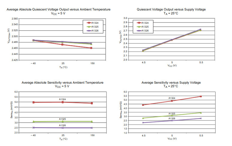 Looking at the plots above we can see that in normal conditions when the ambient temperature is 25 degrees and there is no magnetic flux the output voltage should be approximately 2.4 V.