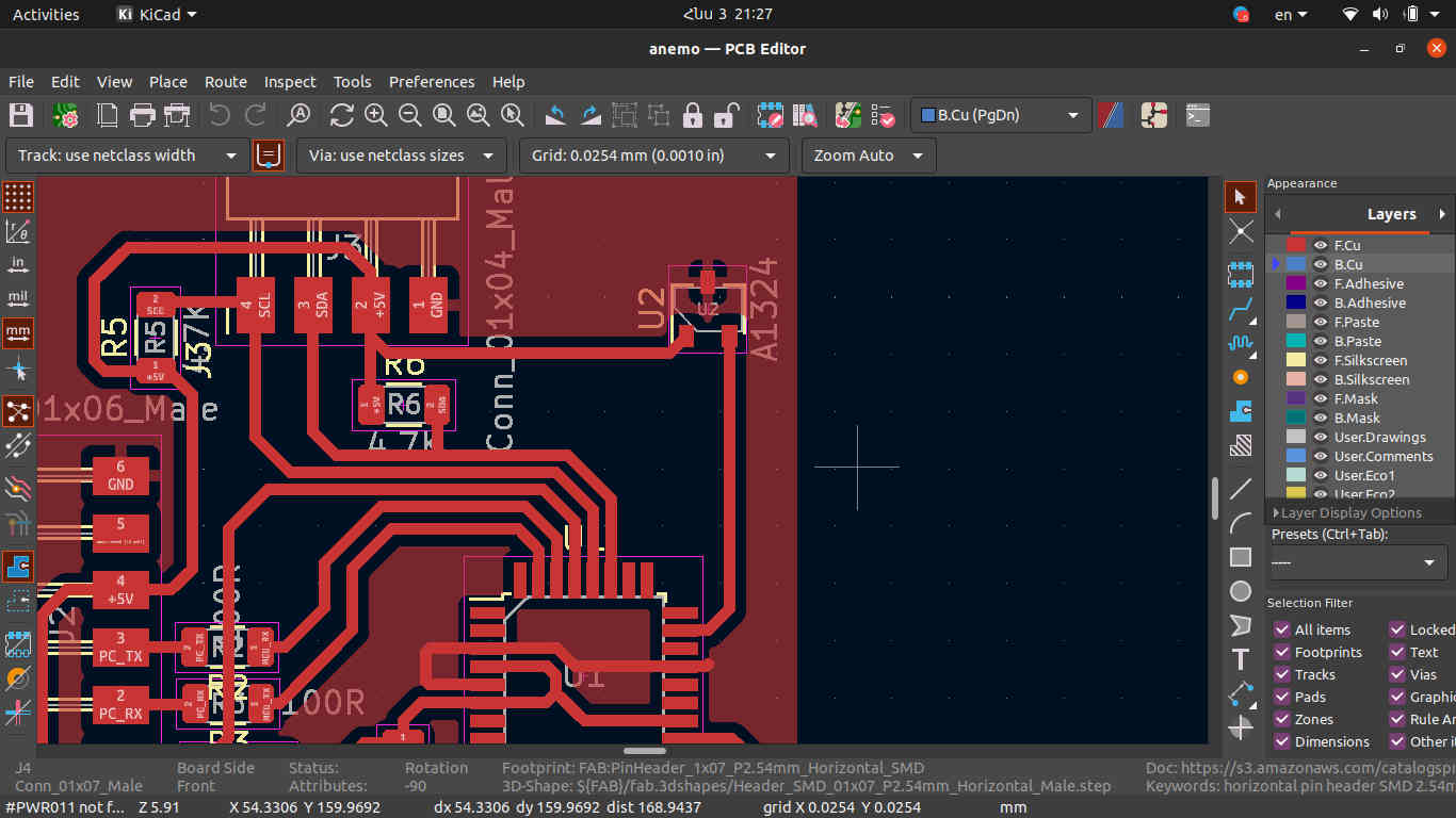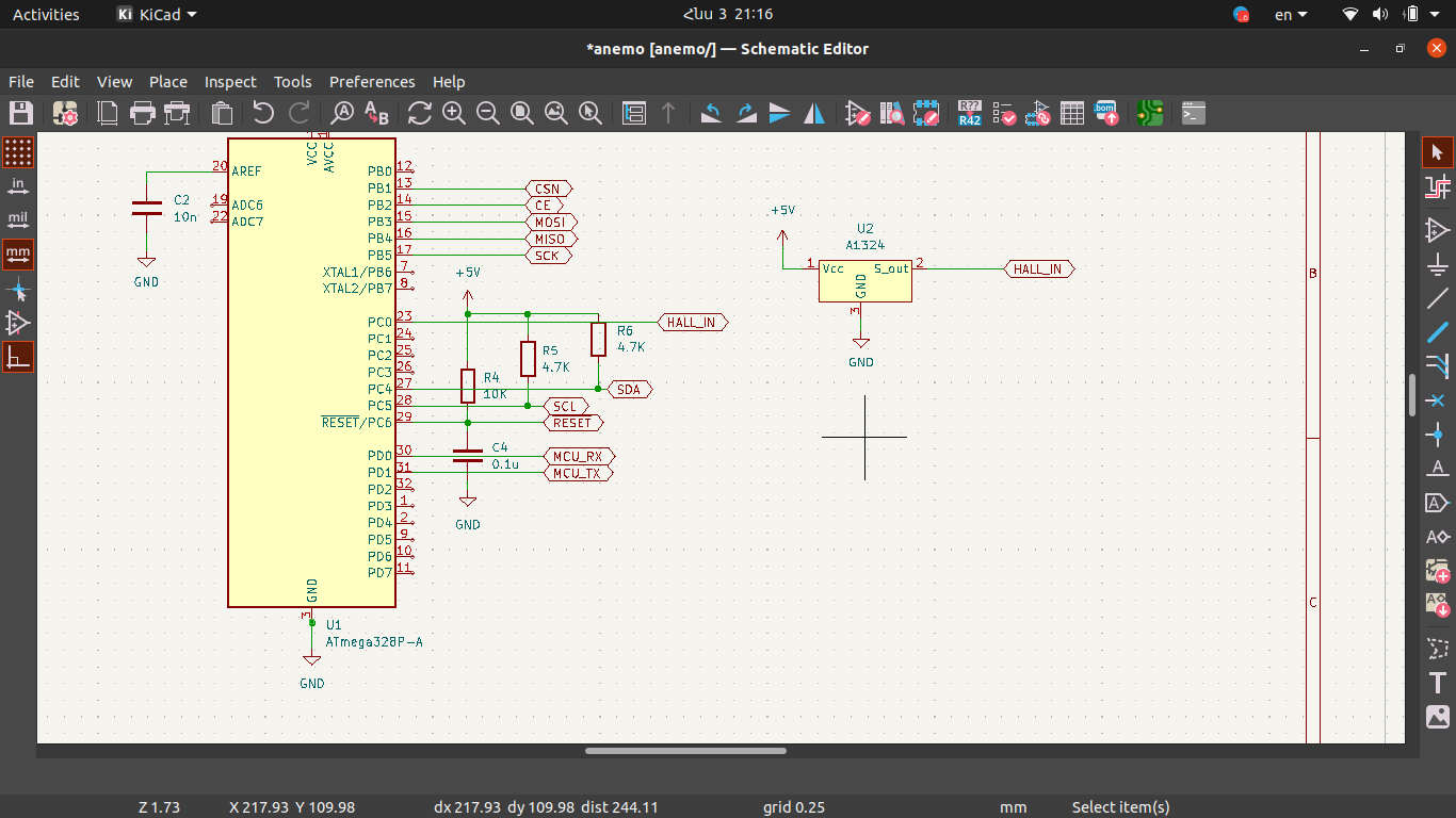 There is nothing special in the layout, the only thing is that I intentionally placed it near the edge of the PCB, I am going to design the anemometer in a way that the wing with a strong magnet should pass through the top of the sensor. So, I placed it further from other electronic components to avoid interference with the magnetic field that the magnet creates. The next part is about programming and testing.