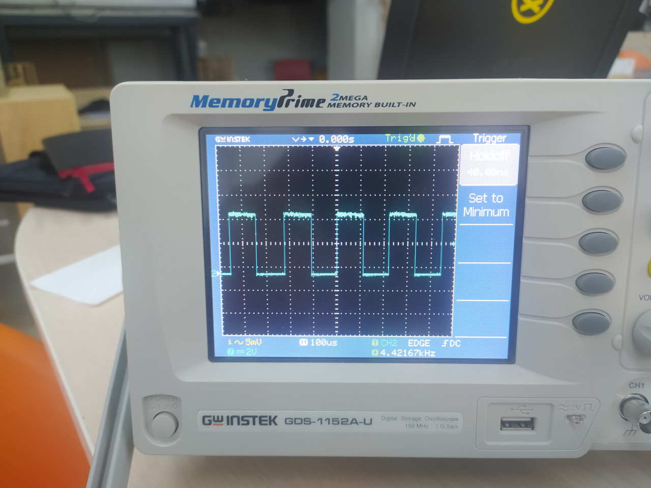 I measured the frequency of the signal that was generated by the PCB. As an image shows the frequency is 4.4Khz and that’s why I put 4000 as one second in the code.