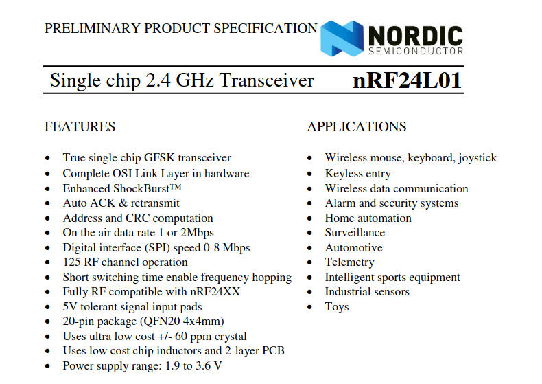 The NRF24L01 is a radio transceiver that works at 2.4Ghz-2.5Ghz frequencies. Here you can see some shots from the datasheet to get more information about NRF.