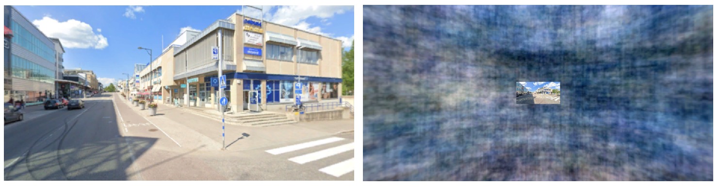 For the first pilot, we decided to test our ideas by presenting the stimuli using a VR headset, we expected that more immersive images reflect the role of the N300 in real life situations, and not just highly controlled environments. We use naturalistic scenes as our stimuli. Half of the images in the experiment consisted of immersive images, presented in 360 degrees, allowing participants to look around. The other half were the same images, but cutout to resemble a regular camera photo, these covered a 14° x 10° visual field, trying to emulate previous experiments using 2D screens, presented over a phase-scrambled background, providing the same low-level features as the immersive images, but with no useful information. This way, we can more directly compare both conditions.