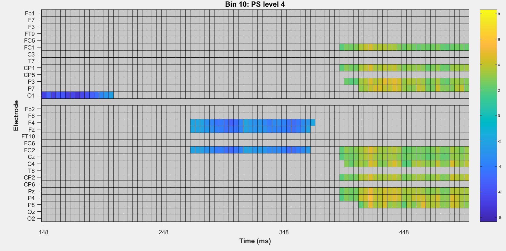 The current results indicate that it is indeed the reconizability of an image that drives the N300 effect. There might still be a non-linear relation between representativeness and N300 amplitude which is yet to be tested. In order to confirm the topology of the signal is consistent with the N300, we ran a cluster based permutation test, using the scrambling level of 5 as target bin, this confirmed that although the effect is weak, our signal is mostly located in fronto-central electrodes, matching the N300 in a ~250-350ms time window.