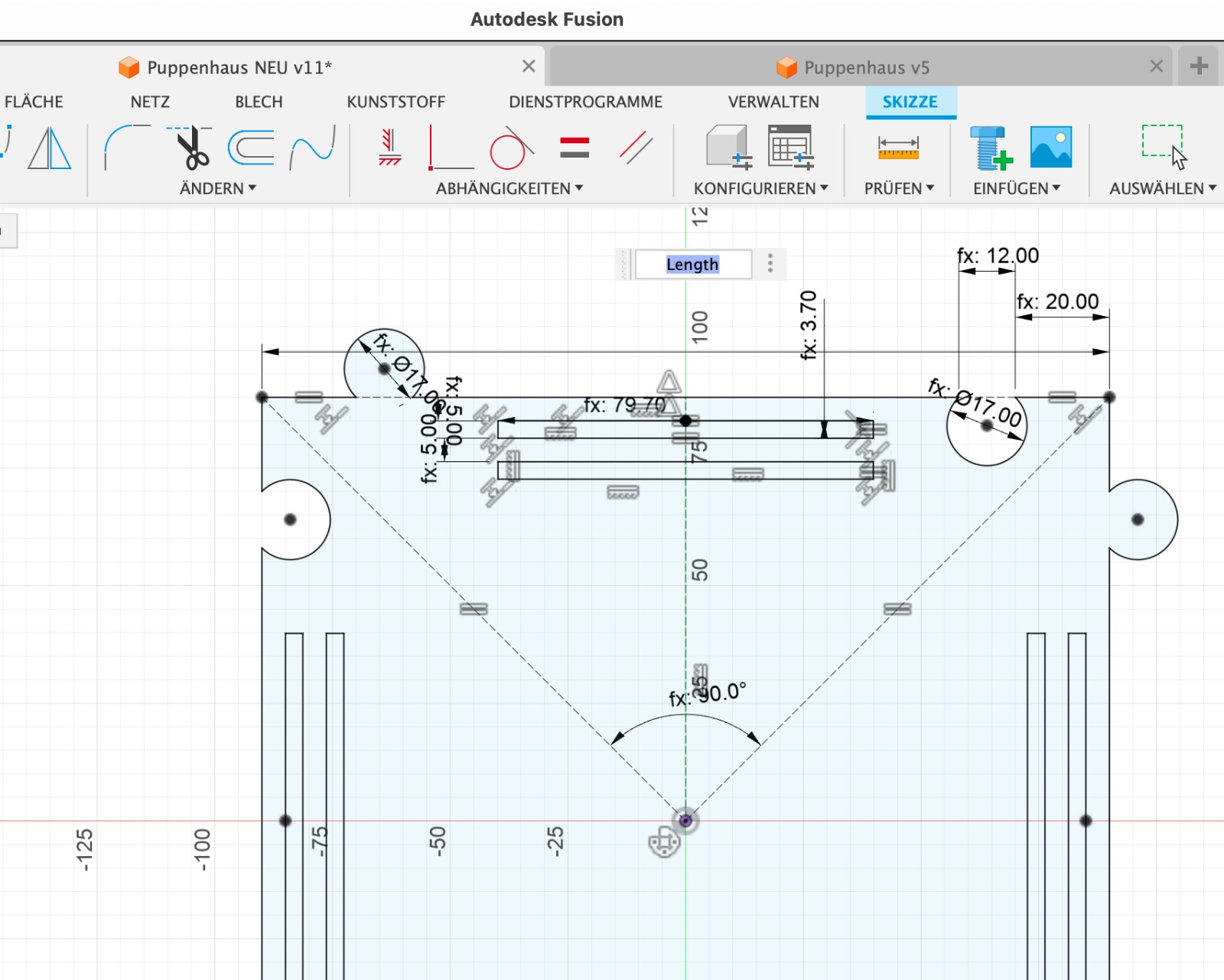 Now I could work with the specified parameters. This works in such a way that when individual lengths or other parameters are determined, no fixed numbers are entered, but rather the names of the parameters (e.g., Length). The advantage is that we can quickly change the design when we replace individual elements.