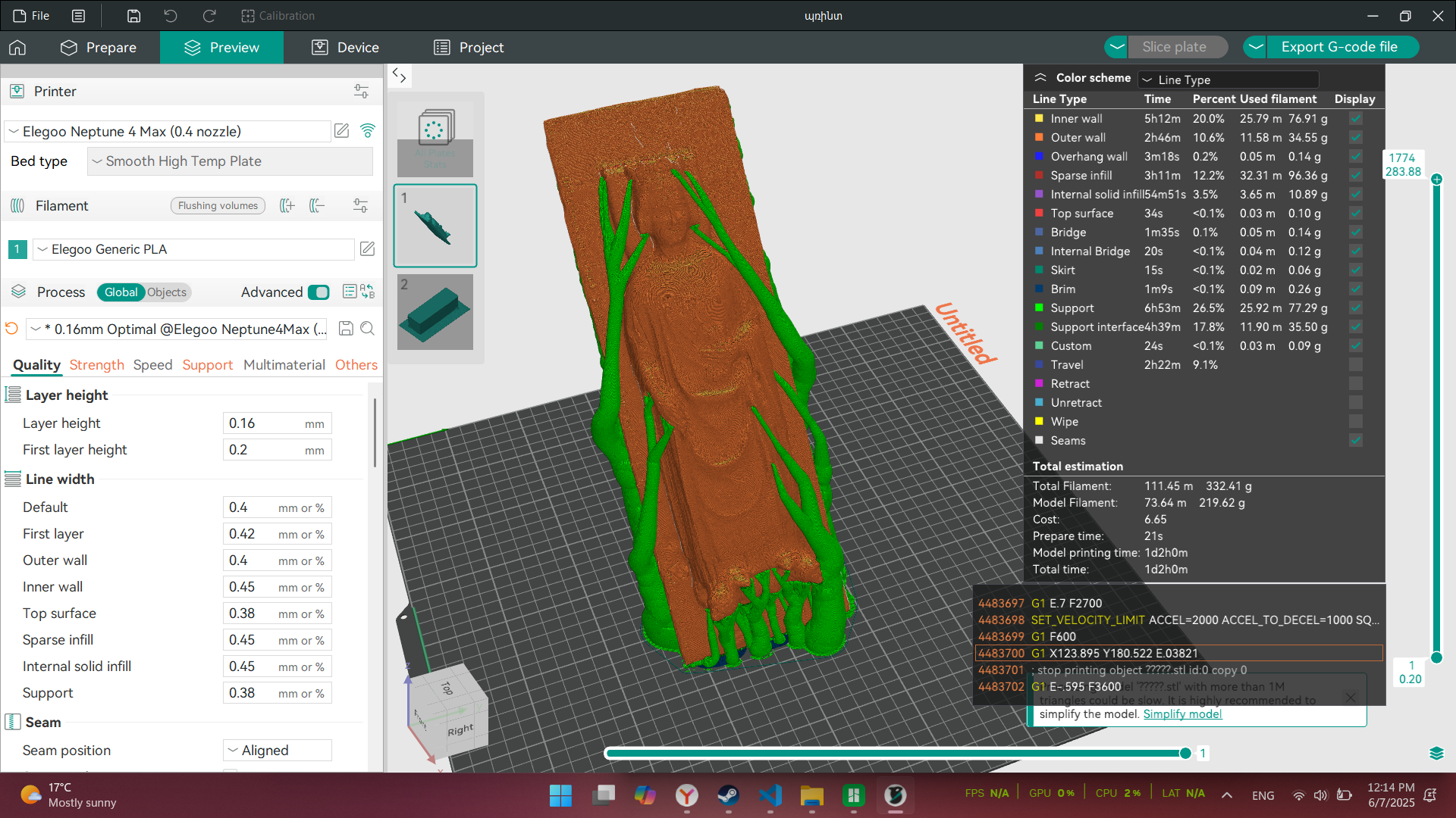 I am 3D printing a miniature model on Elegoo Neptune Max, to save the printing time I separated the tomb into two parts. 3D printing in this position made layers not much visible and avoid of top surface topographical appearance.