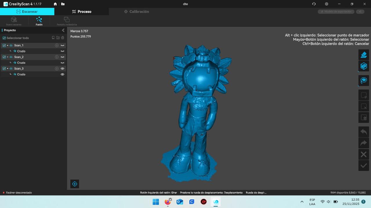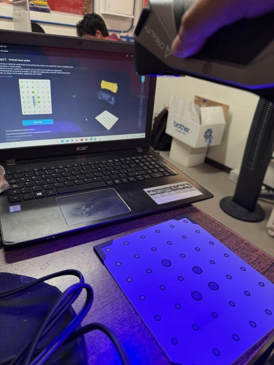 Once the scanner was ready and properly calibrated, I placed the object on the work surface and began the scanning process. To do this, I held the scanner and moved it slowly and in a controlled manner around the object, taking great care to maintain an appropriate distance. During this process, the scanner began to capture the general shape of the object. It was very important not to make any sudden movements to prevent the scanner from losing its reference point. I also watched the screen as the system began to record the information to rule out any errors.