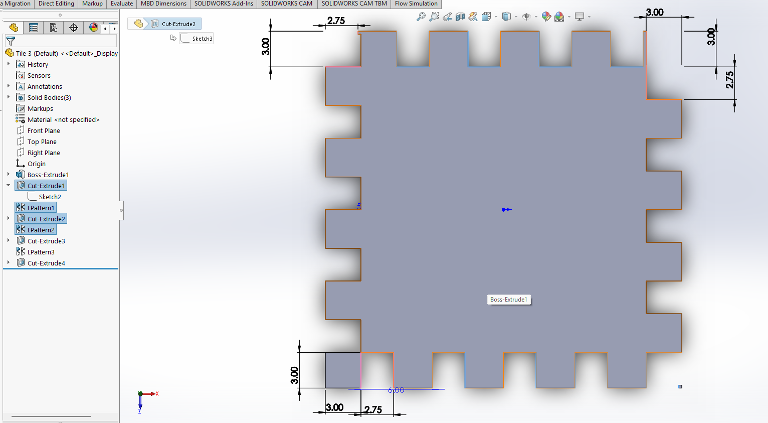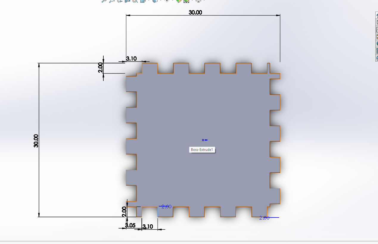 For the parametric designs, I designed dented square (30mmX30mm) pieces with SolidWorks.The dents were 2.75mm intended to accomodated a 3mm tooth, cutting 3mm deep into the dent. I found the kerfs to be around 0.25mm (2.75mm dent is enough space to fit a 3mm tooth without breaking either of either of them, and obviously eliminate the looseness). I cut all my pieces from a 3mm MDF wood with the EPILOG LASER MINI lasercutter.