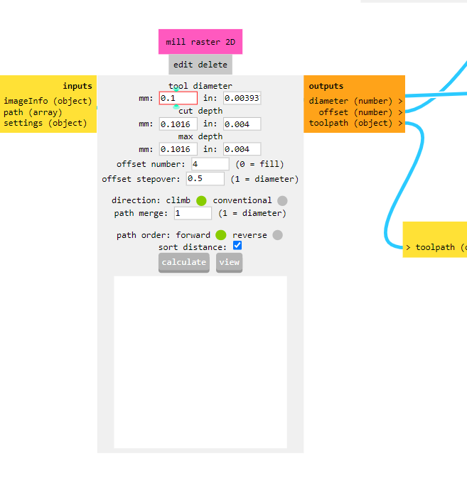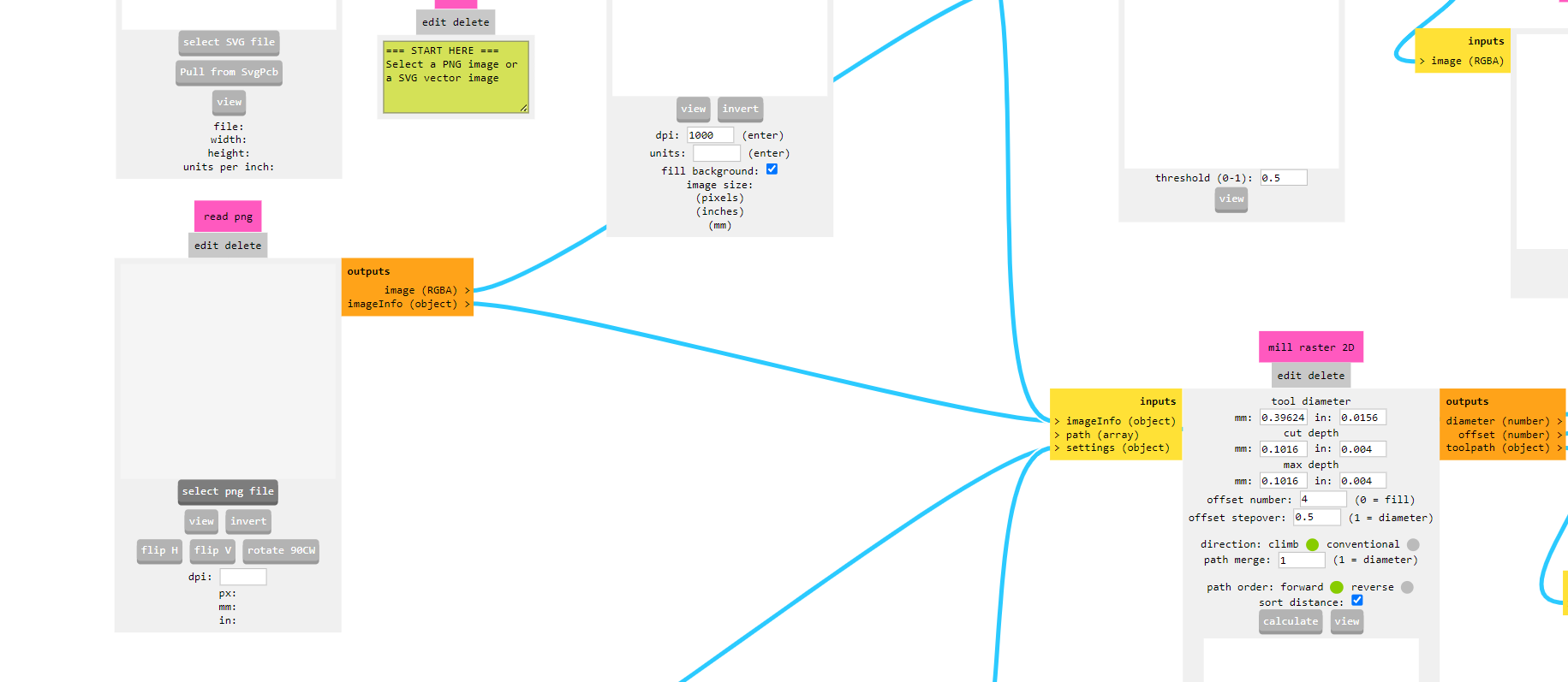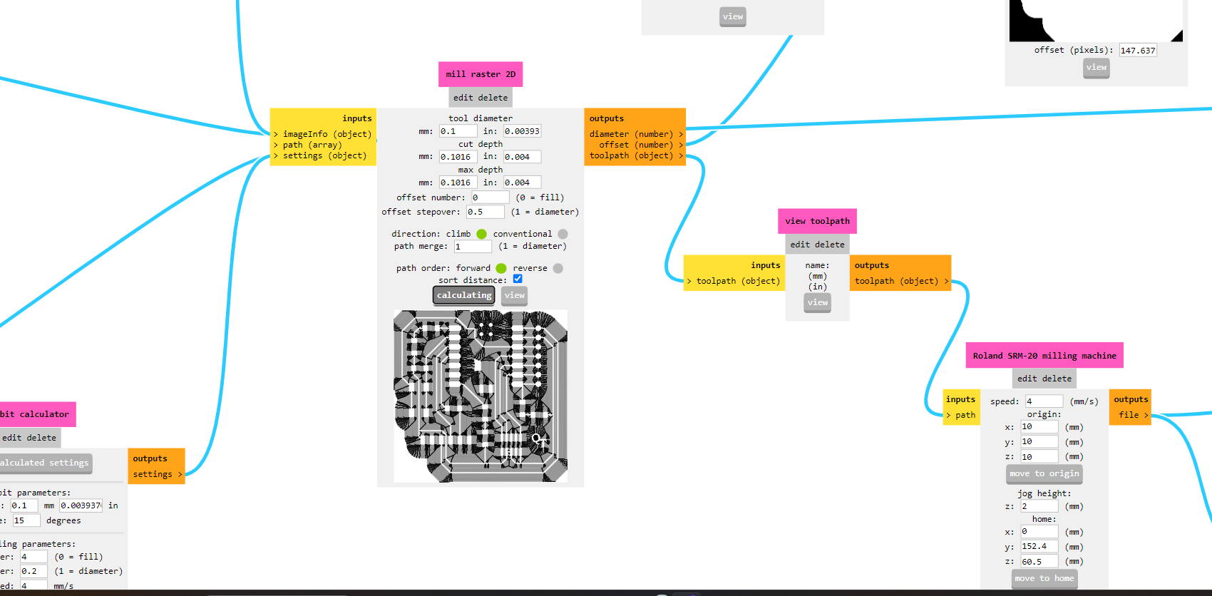 Set up the tool size and cut depth Itried lots of offsets before I understood what do: It's how much cleared of unnecessary copper layer your final PCB is. This one had the default 4 [passes around the trace].