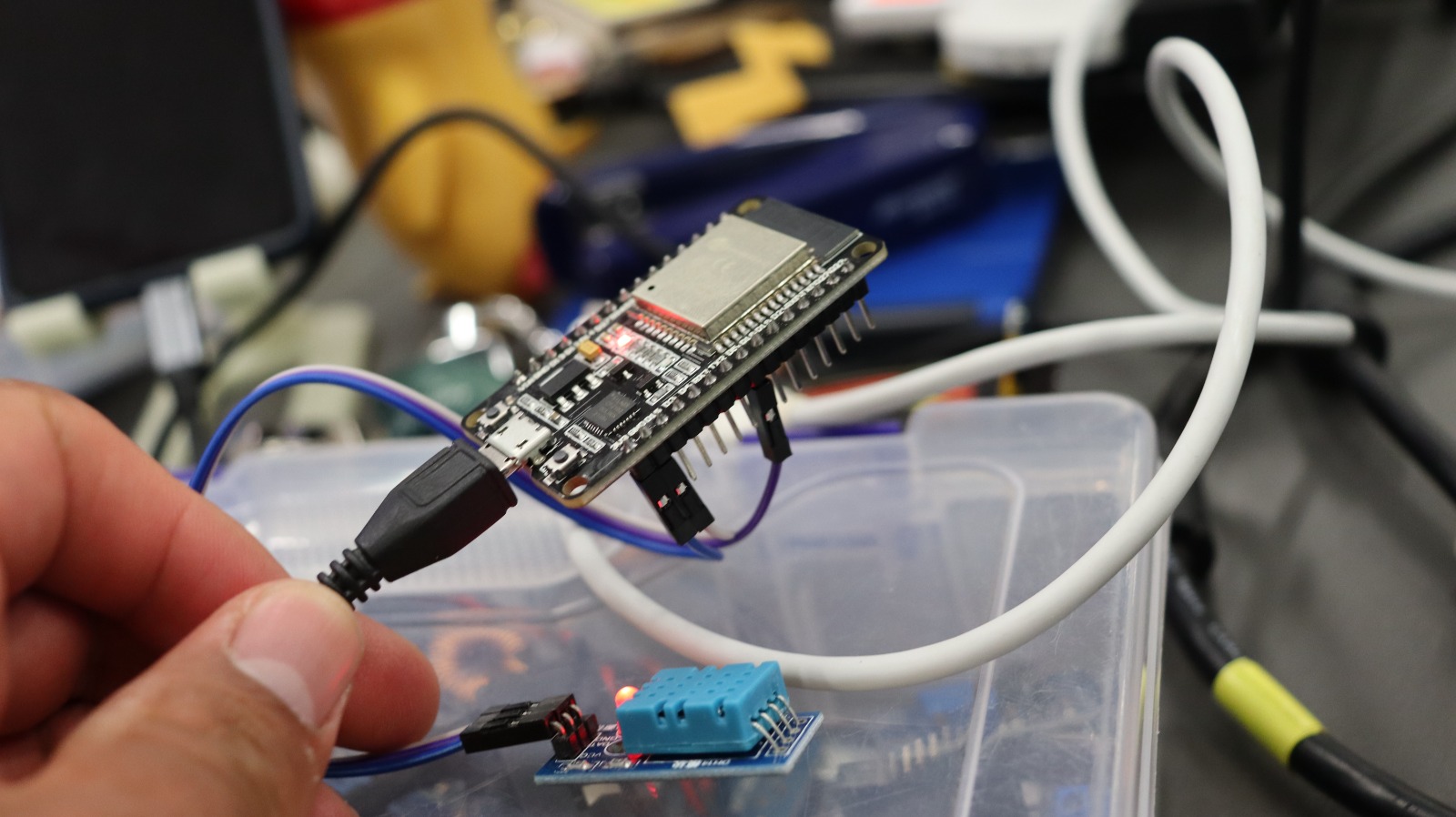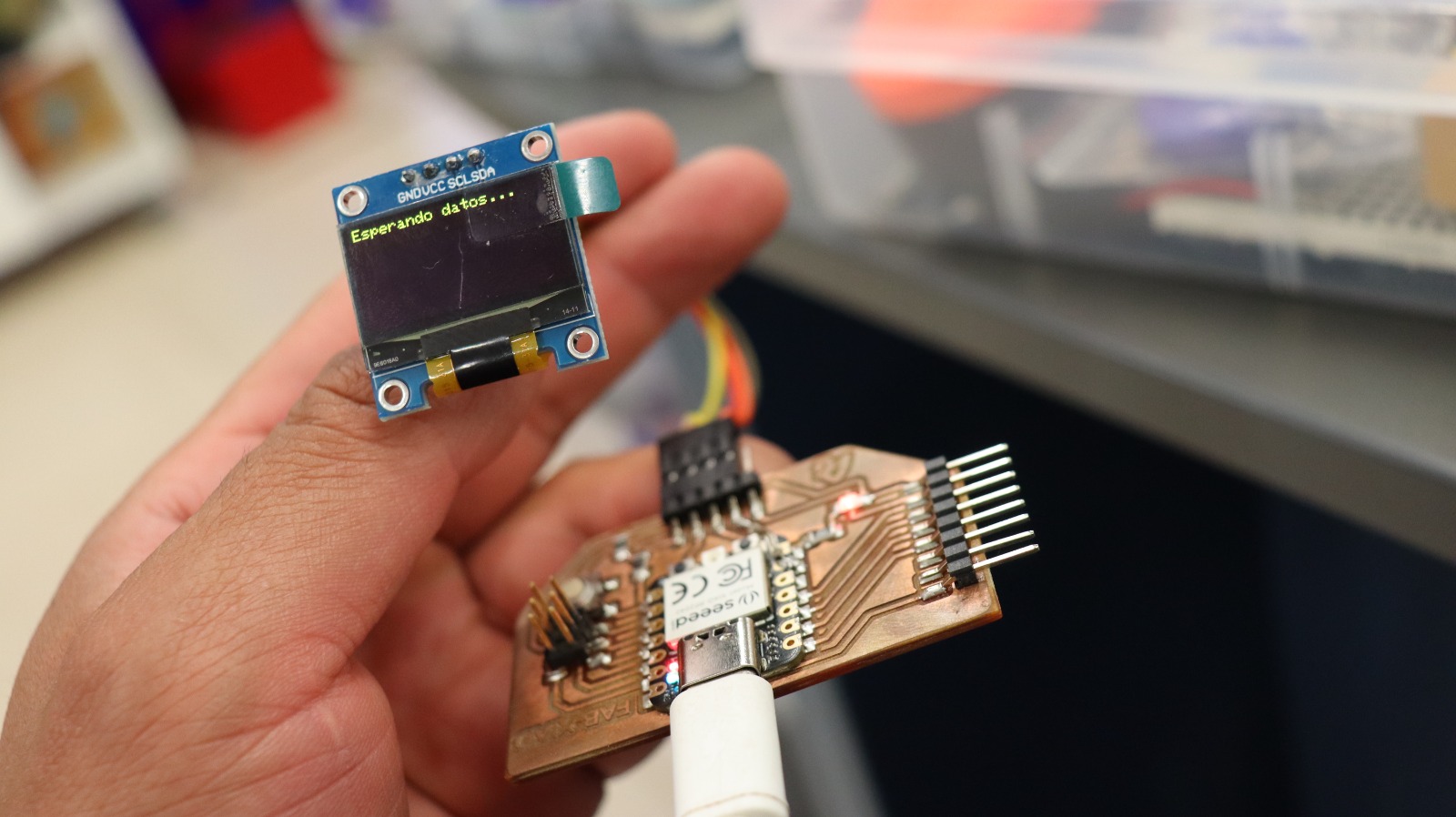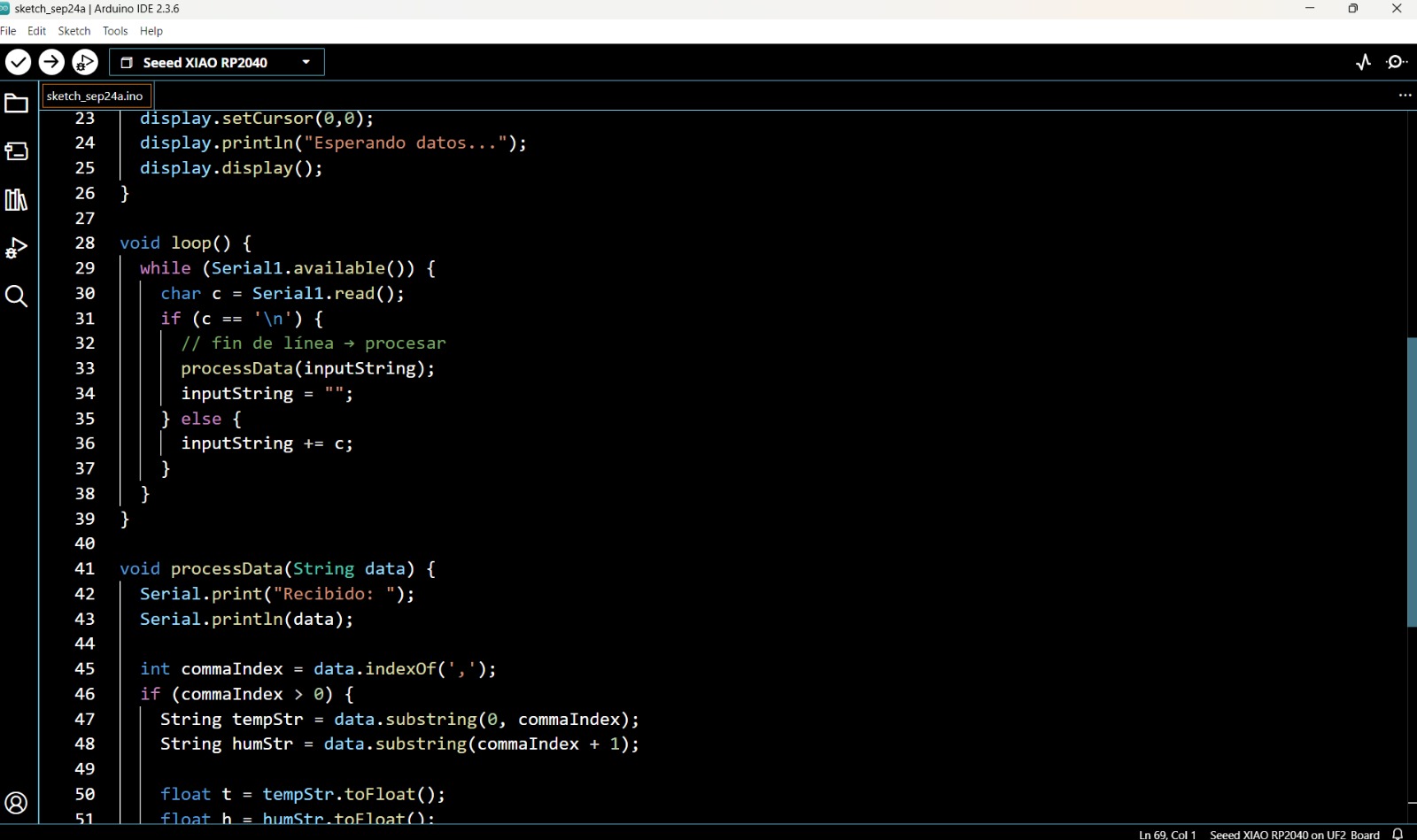 The project presented below seeks to integrate the connection between an ESP32 DEV MODULE board and the well-known SEED XIAO RP2040 electronic board, using the data sending and receiving switches. We retrieve the data through a DHT11 humidity sensor, which will be reflected on an OLED display on the SEEED XIAO RP2040 board.