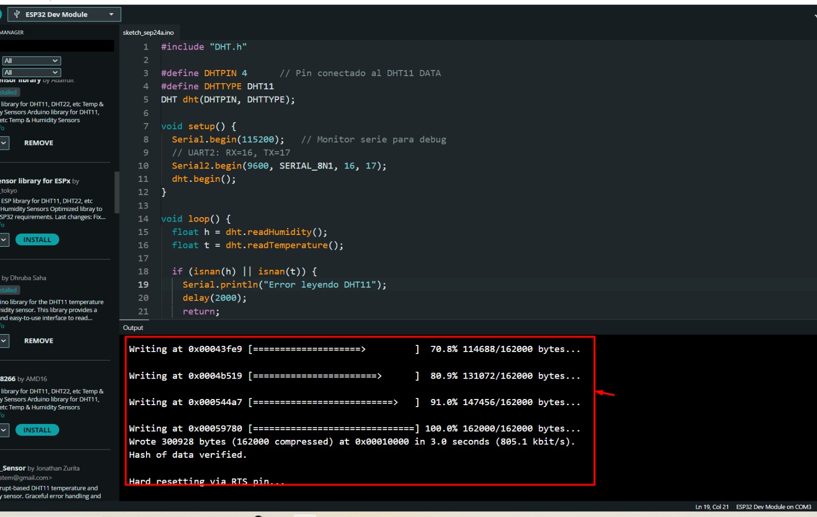 Serial.printf("Temperatura: %.1f °C, Humedad: %.1f %%\n", t, h);