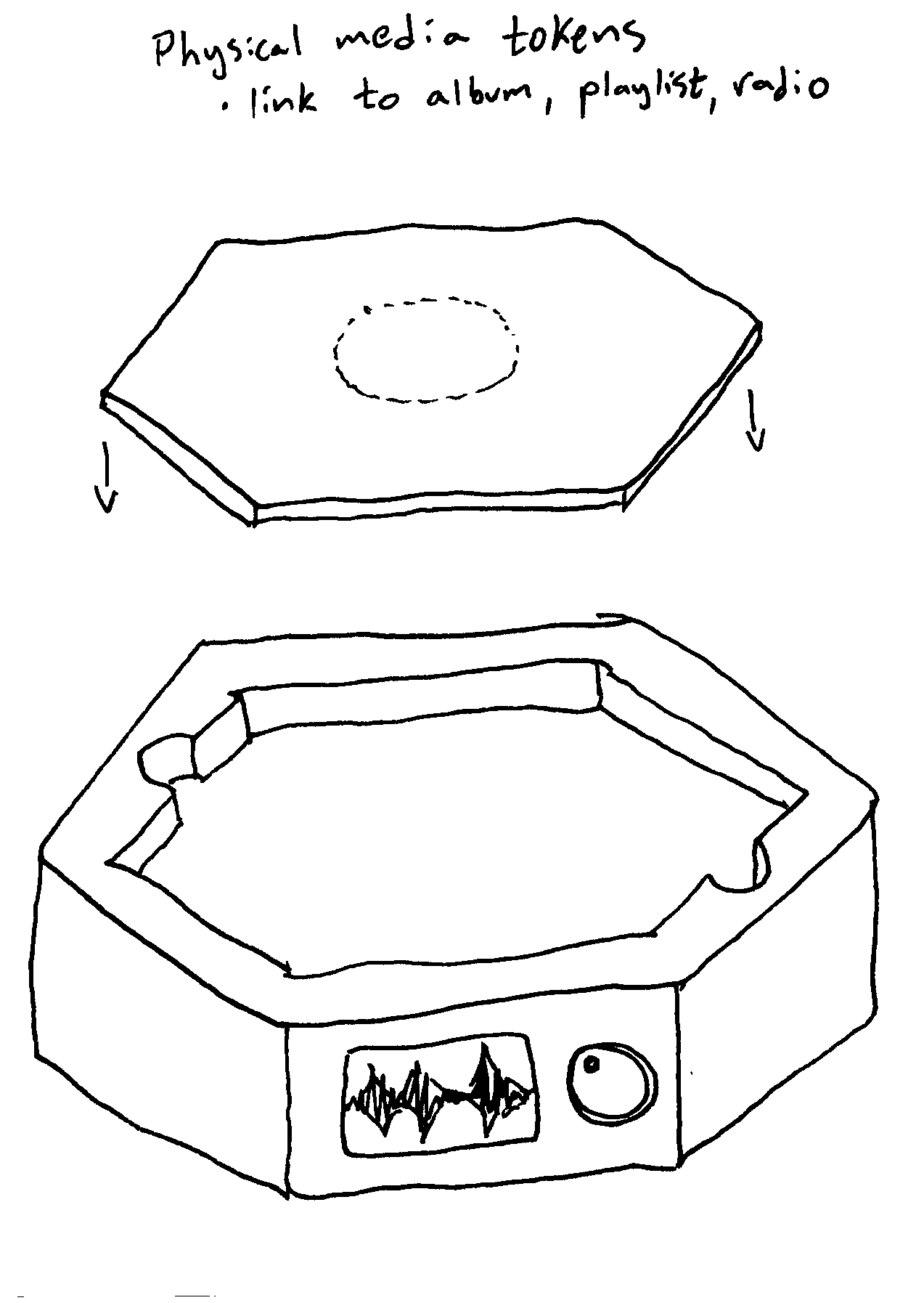 A collection of wood tokens start a playlist when set on the player. The tokens bring back some tangibility to the act of choosing and playing music. They can also load internet radio stations.