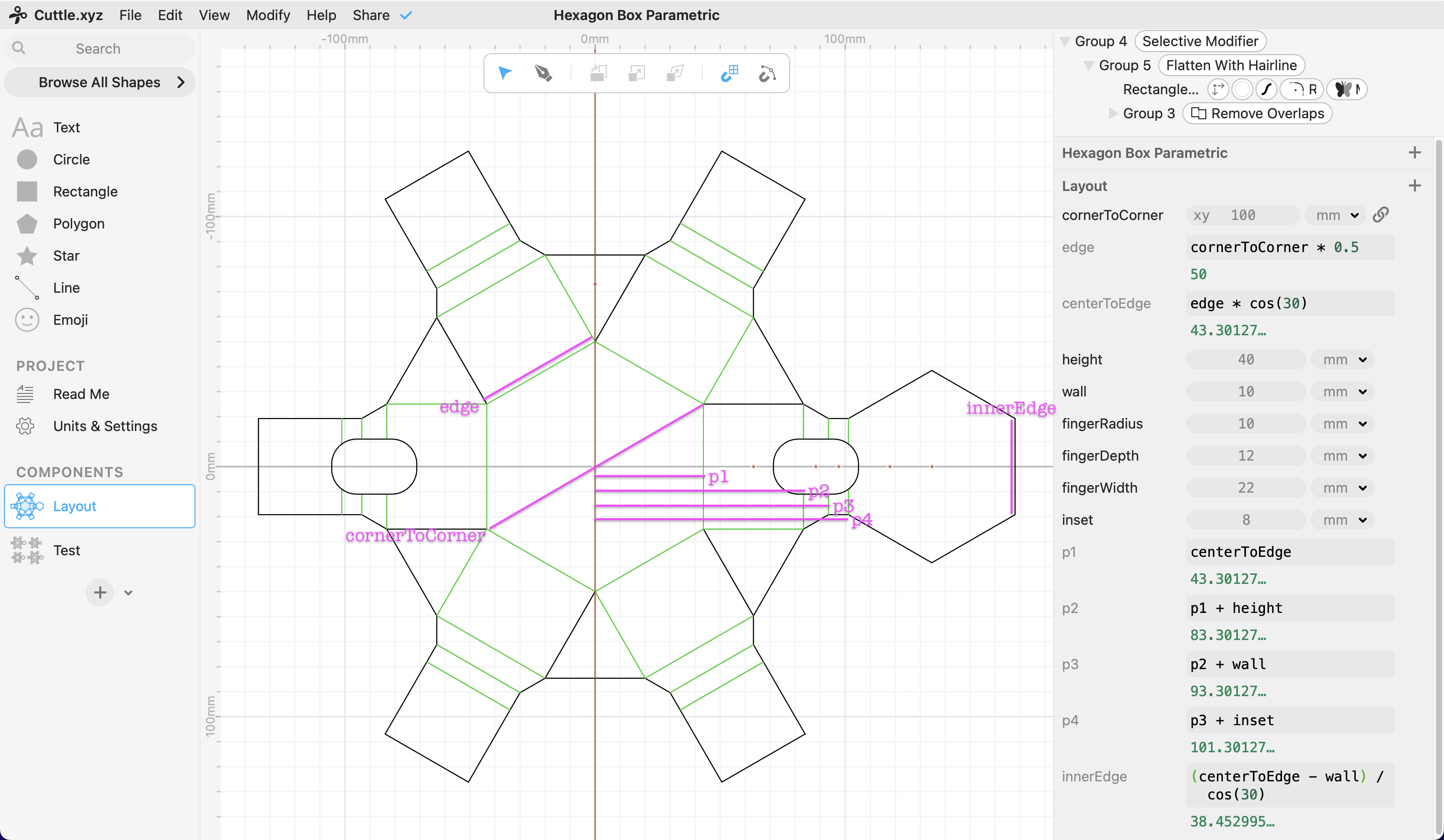 Cuttle pro tip: make any reused math expressions into parameters. This screenshot labels these derived parameters where they are used in the design.