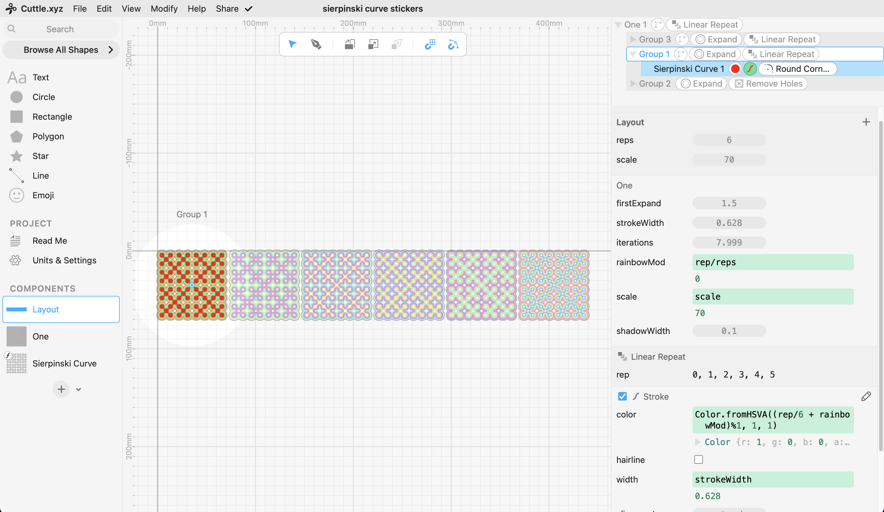 In Cuttle, I started from a code component that creates the basic curve. Then I stacked modifiers to expand the curve by different amounts, and color the strokes.