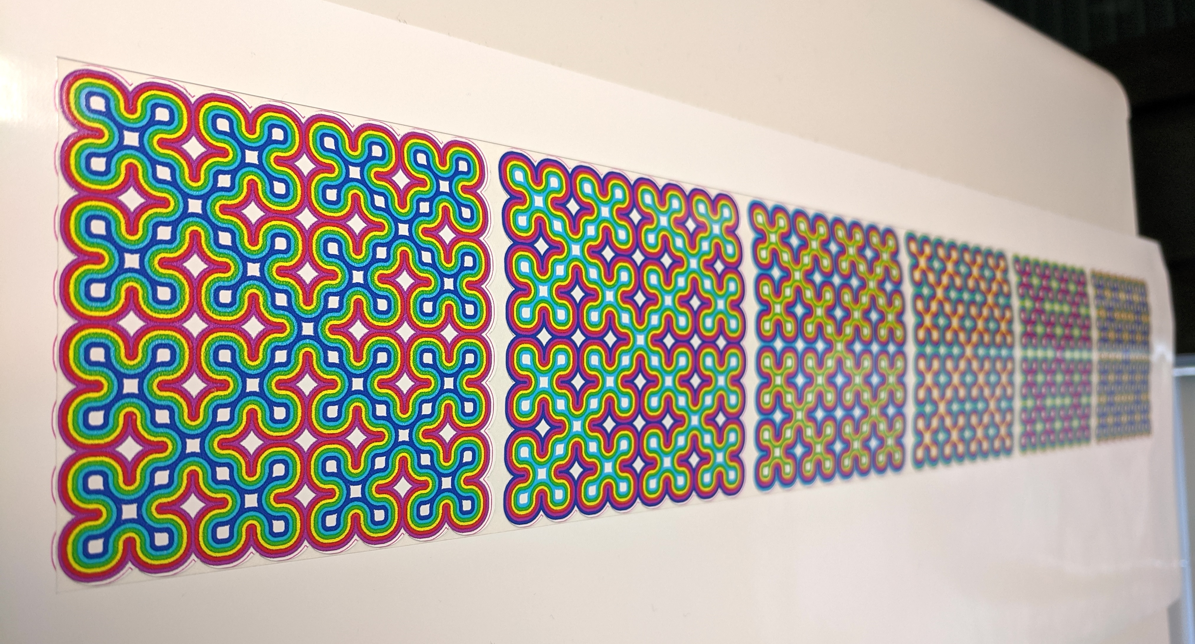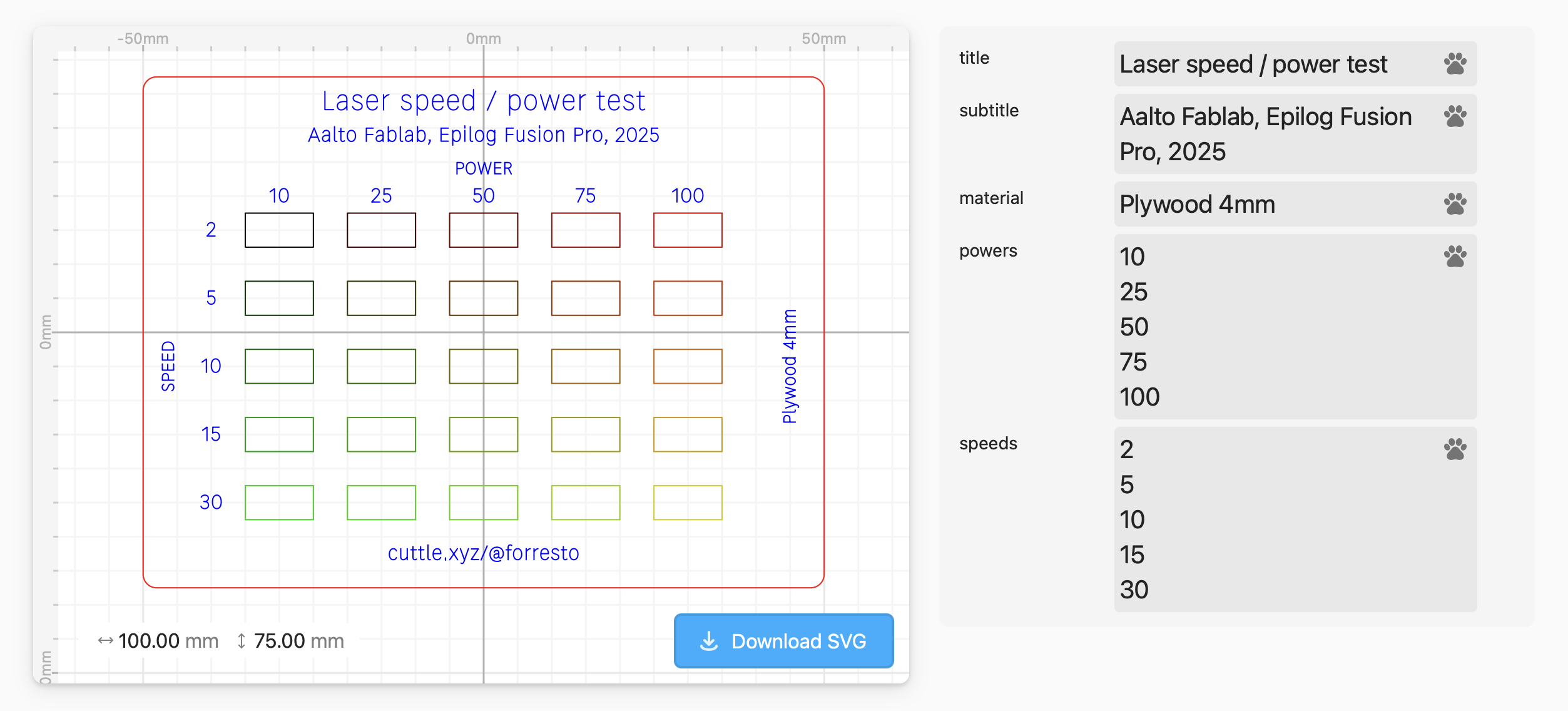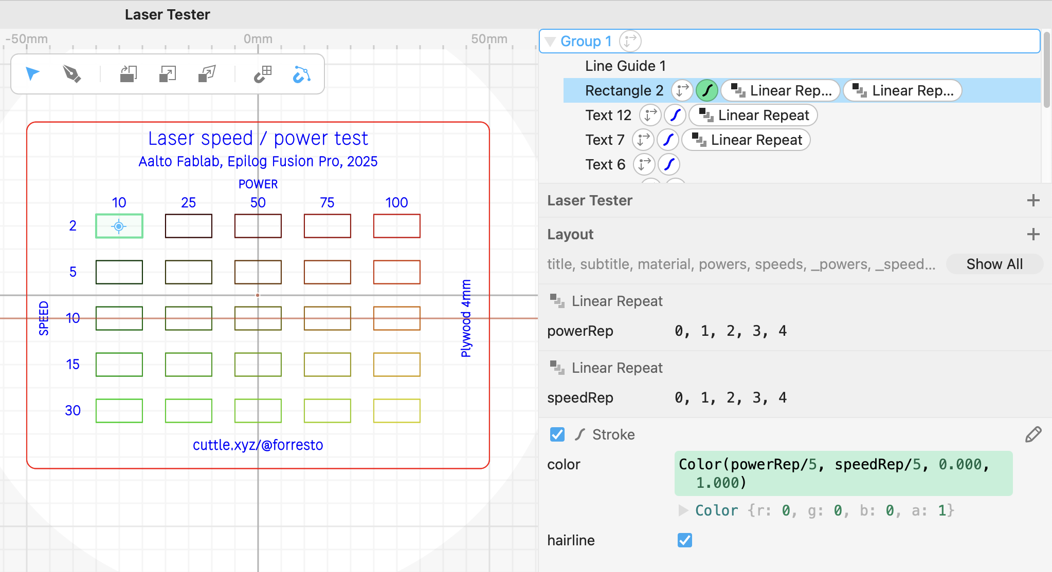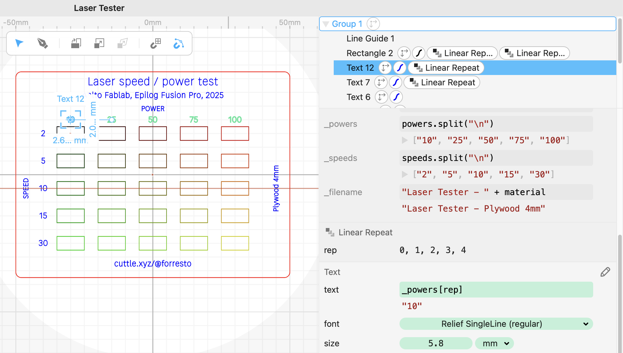 By making the labels parametric, I was able to make testers for different materials without changing the design. I used a pattern with the parameters that each line of the text input becomes a label. Cuttle supports JavaScript in the parameters, so I made derived parameters like this: