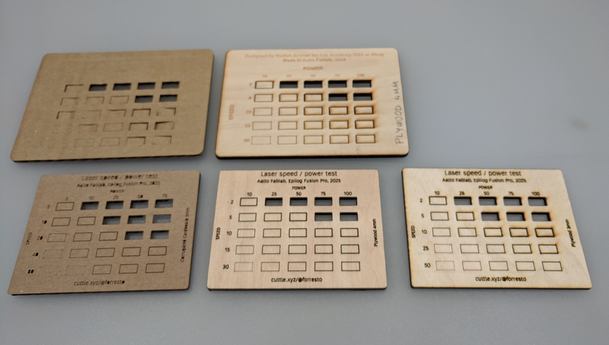 Aalto Fablab's laser cutter is an Epilog Fusion Pro. It had some maintenance the day before. It is nominally 80w, but the tube is well-loved and according the the folks that did the maintenance it is closer to 35w now. So it is due for a tube replacement.