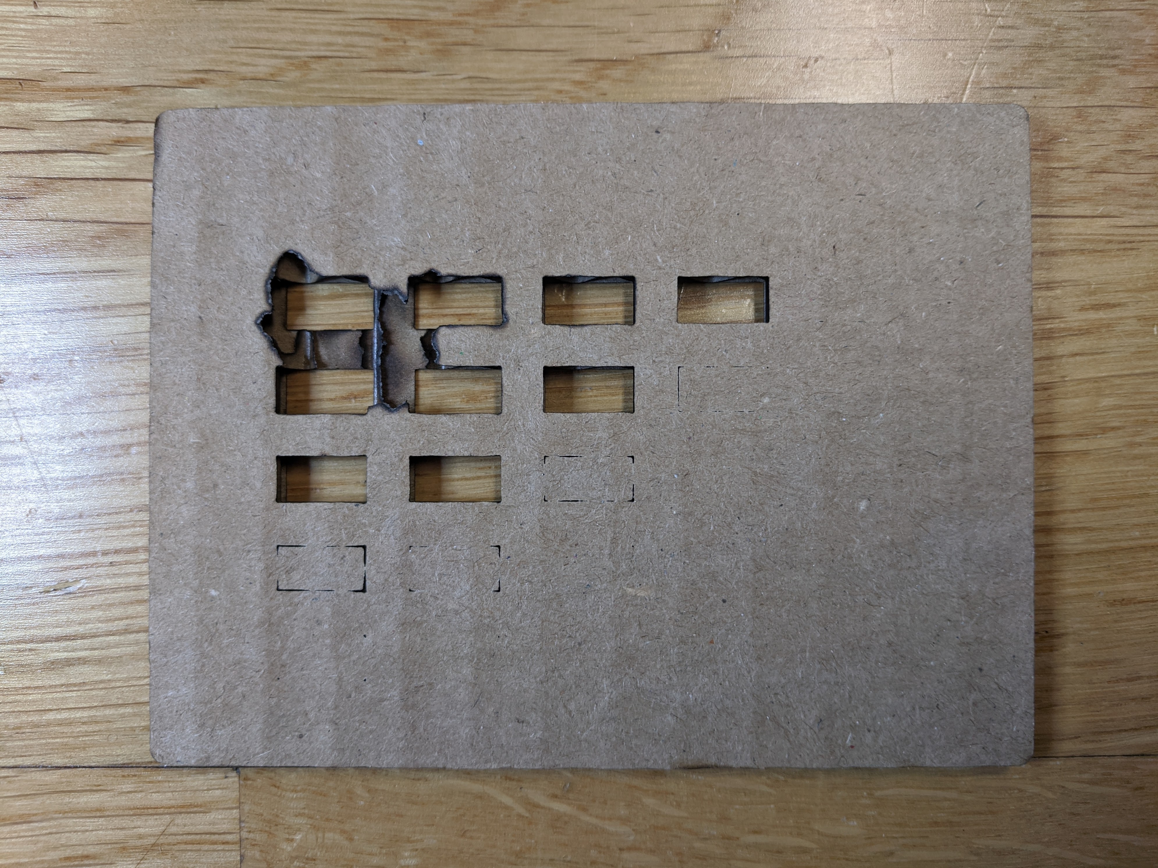 I made my first fire with the laser cutter. While doing the cardboard test cut, the rectangle with the least speed and most power had a small fire on the back of the material. It put itself out fast enough that it did not reach the front of the material, so I didn't notice until I removed it from the machine.