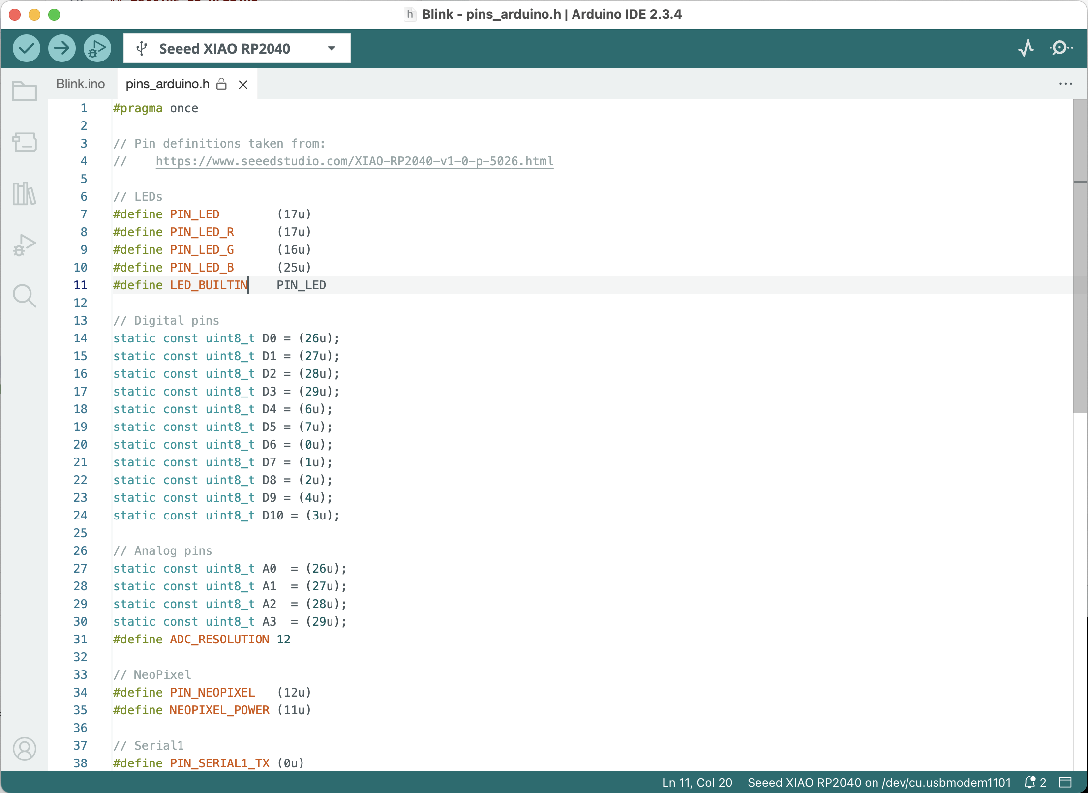 Follow directions on Seeed XIAO RP2040 wiki to make it available in the Arduino IDE board manager.