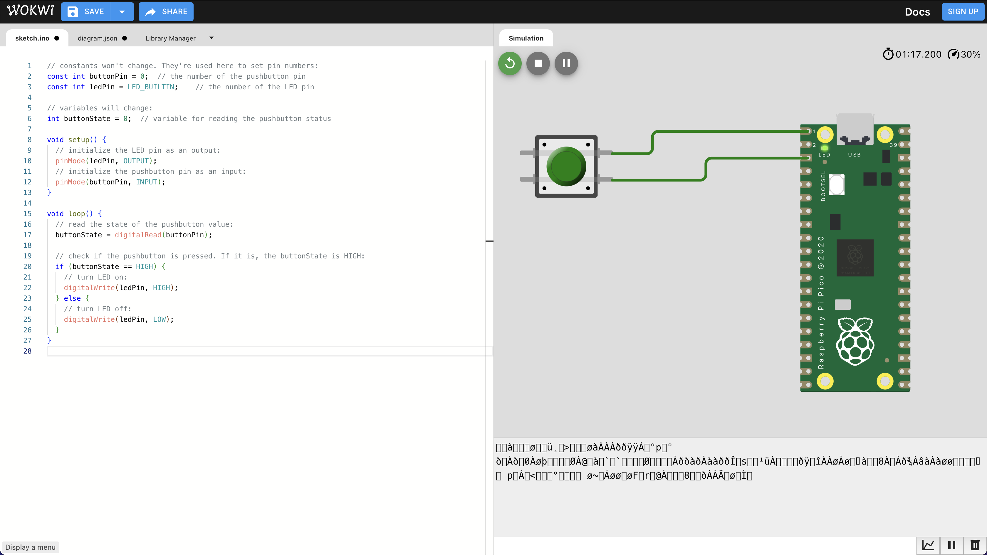 The basics seem to work, although the compilation server might have been stressed with Fab Academy students. The LED turns on and off with the button presses, but it doesn't seem to update with the loop. If I do more with this kind of simulation, I'll try the local version.