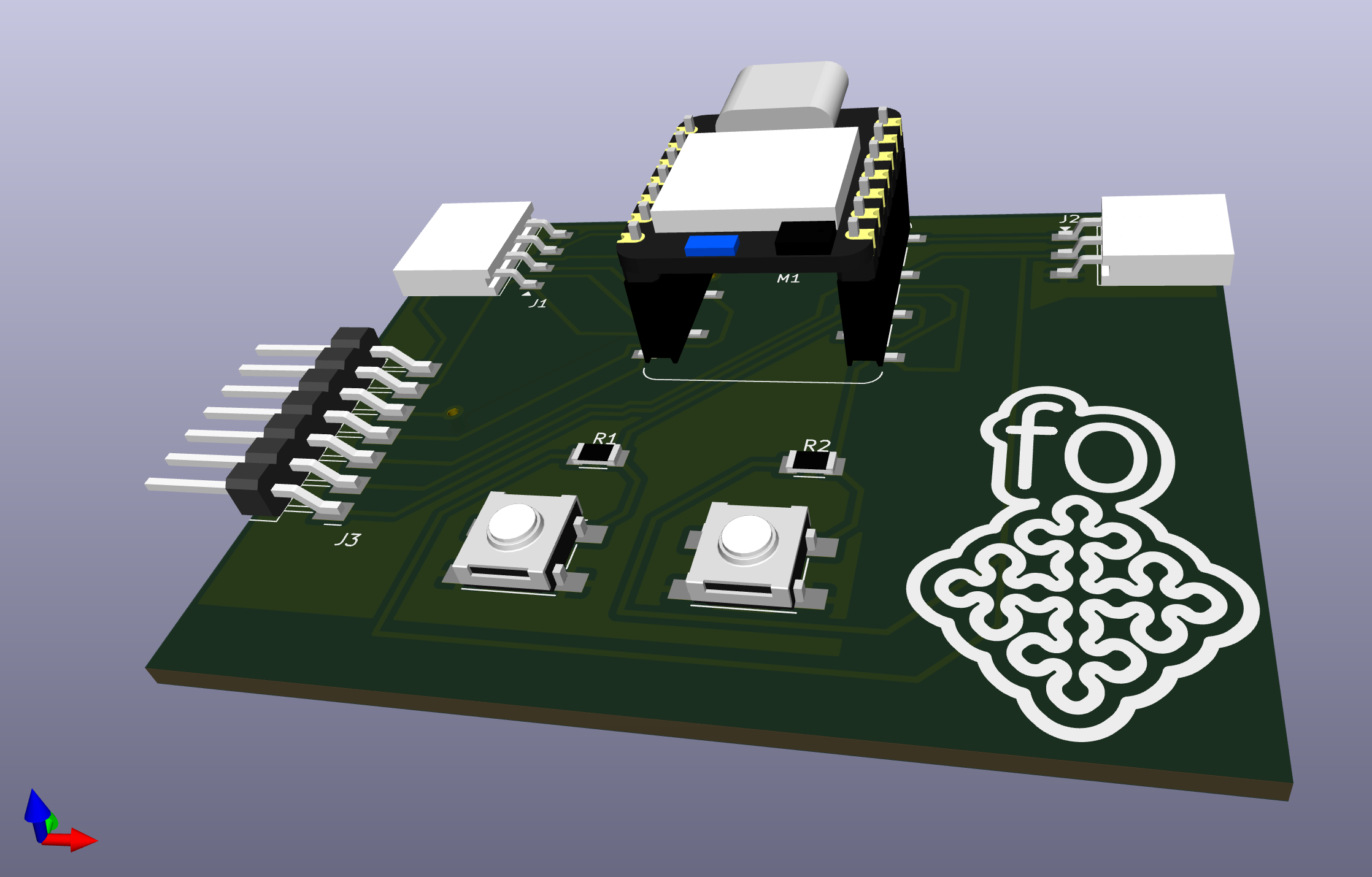 3D result. KiCAD's GLB export misses some of the components, which is a bug to look into. I like the metalic material choice for rendering the copper.
