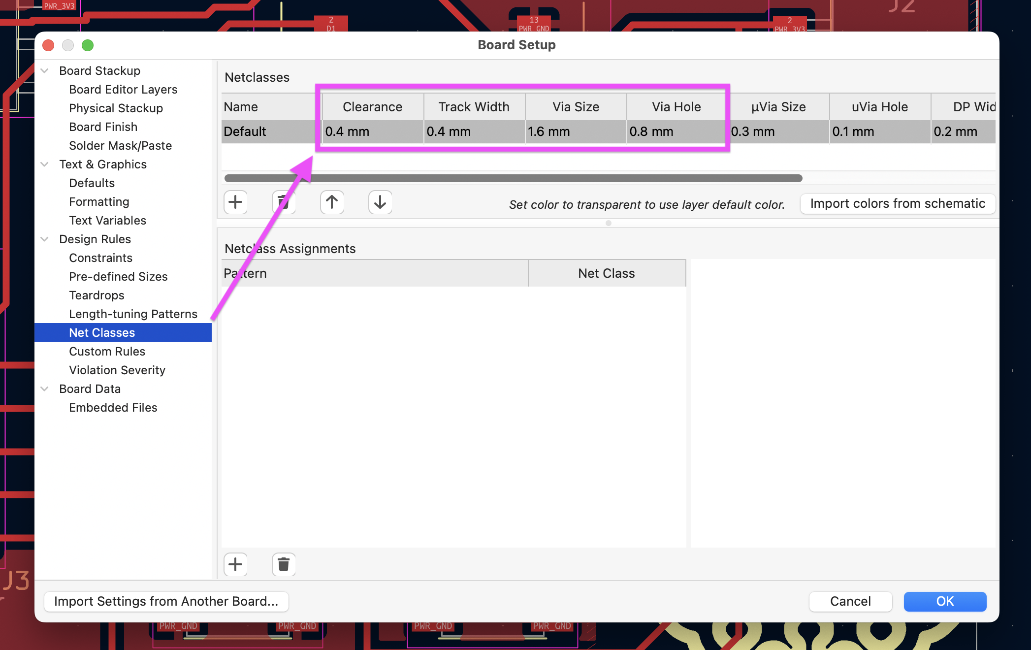 Track: use netclass width > Edit pre-defined sizes > Net Classes.
