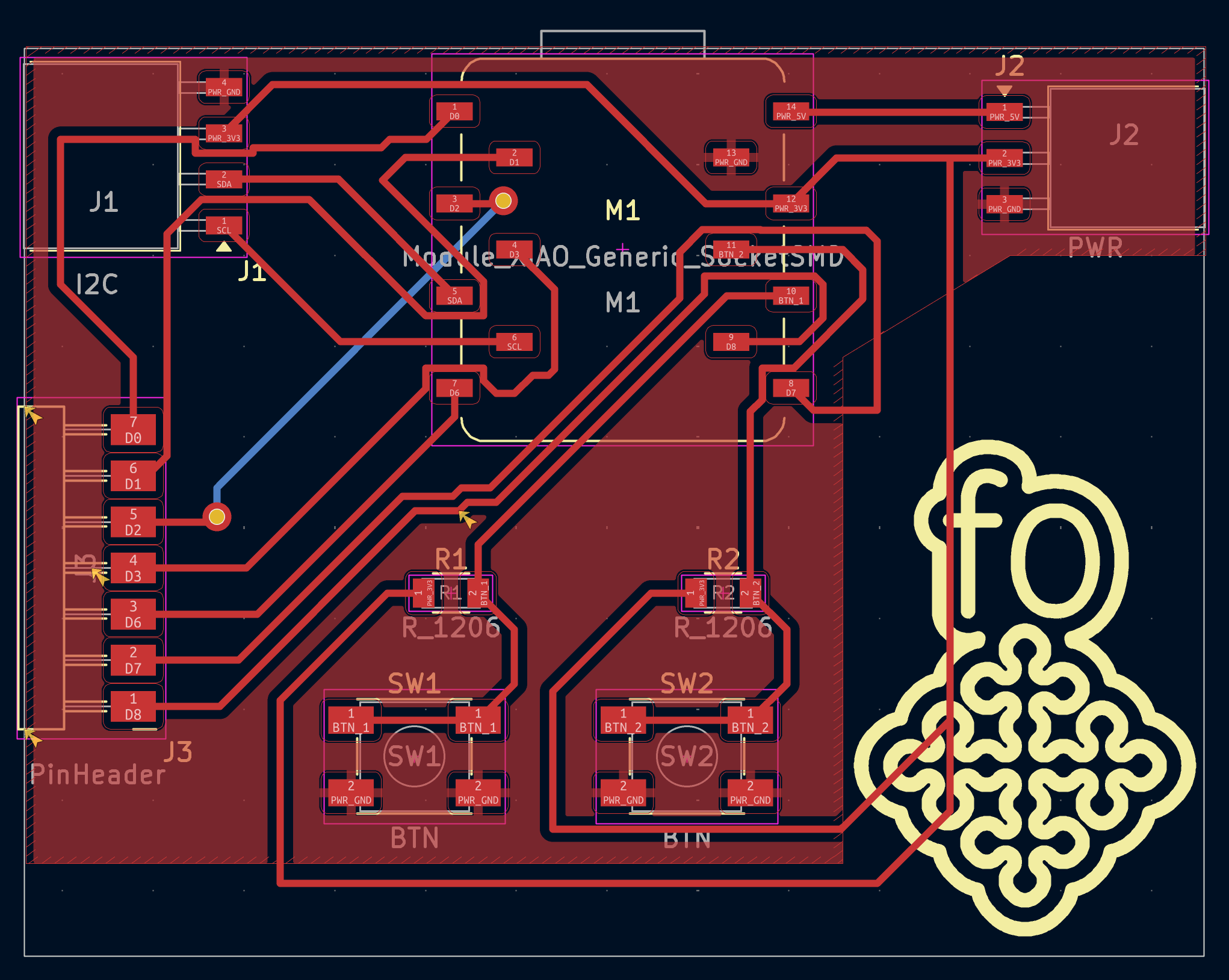I liked the puzzle of getting everything connected. I didn't manage to get one pin connected with a front trace, so I made through-holes with the intention of adding a jump wire to the back.