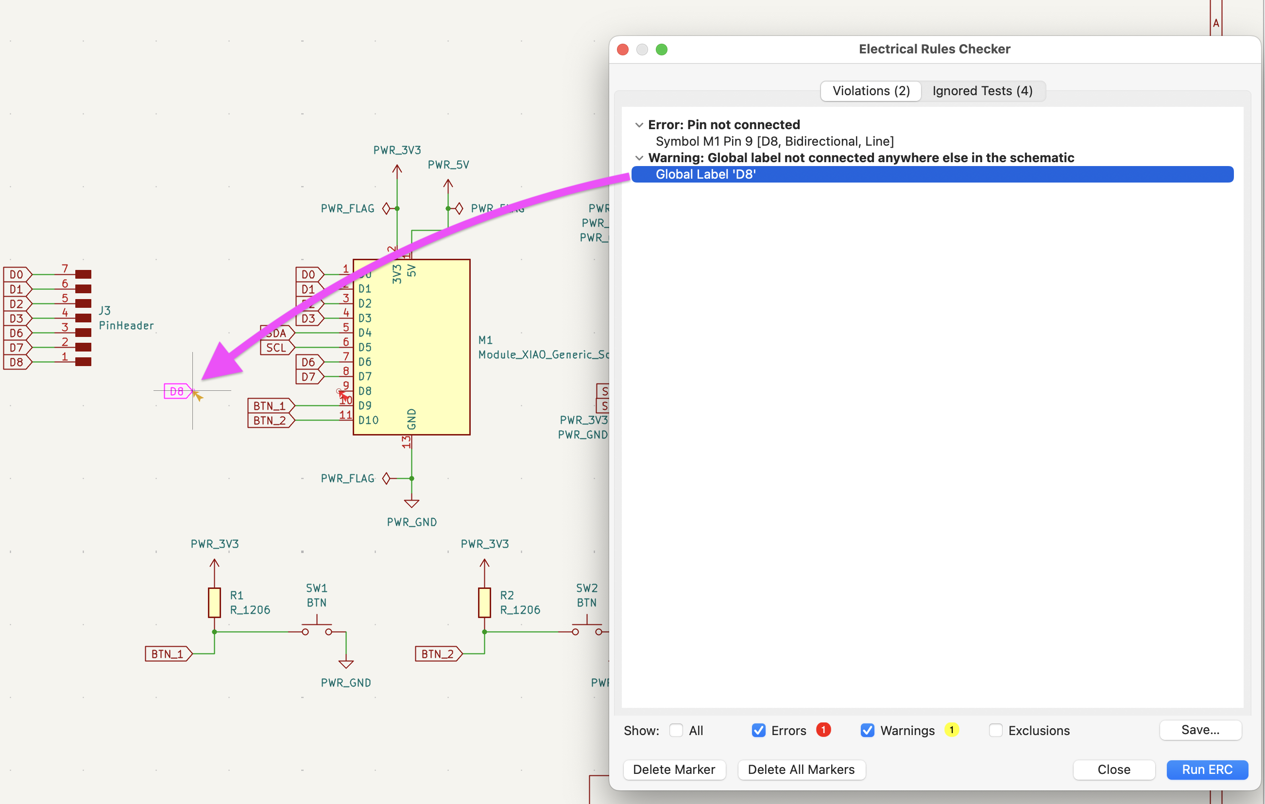 Design Rules Checker showing that the filled zone for power ground is not connected.