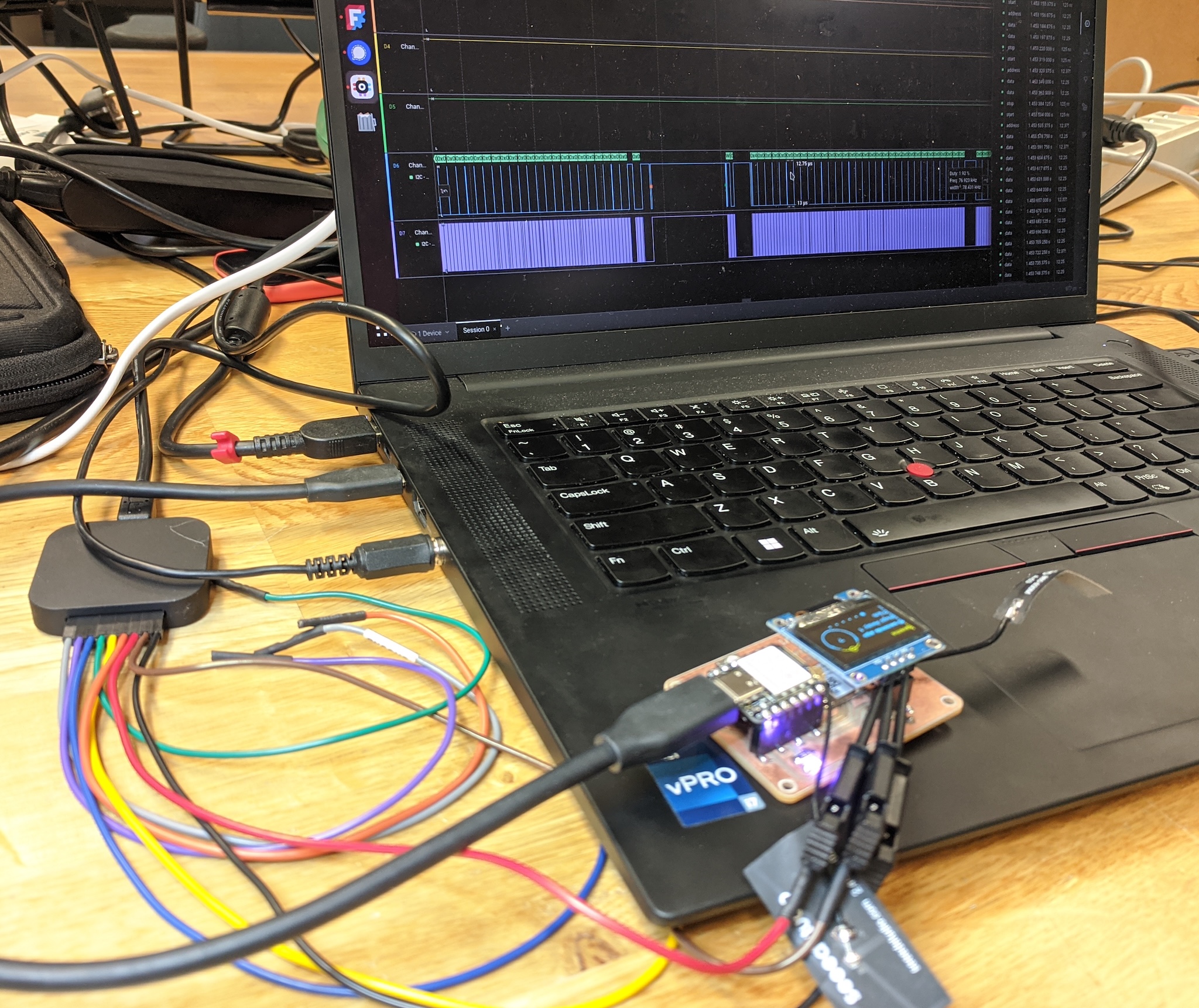 Saleae logic analyser. Used probes to see the signals sent from microcontroller to update the OLED display.