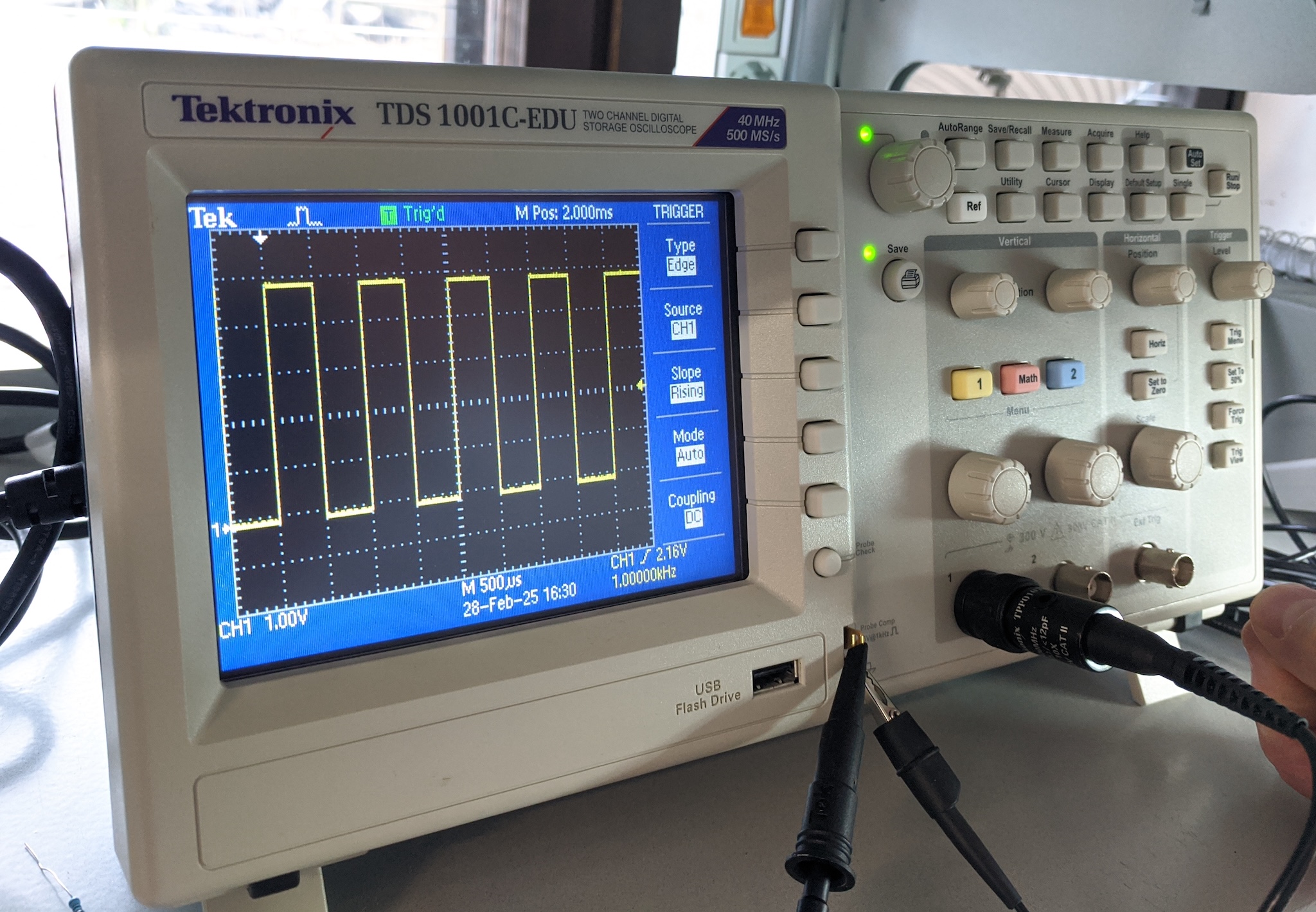 Tektronix oscilloscope. Went through basics of centering and scaling the test signal square wave.