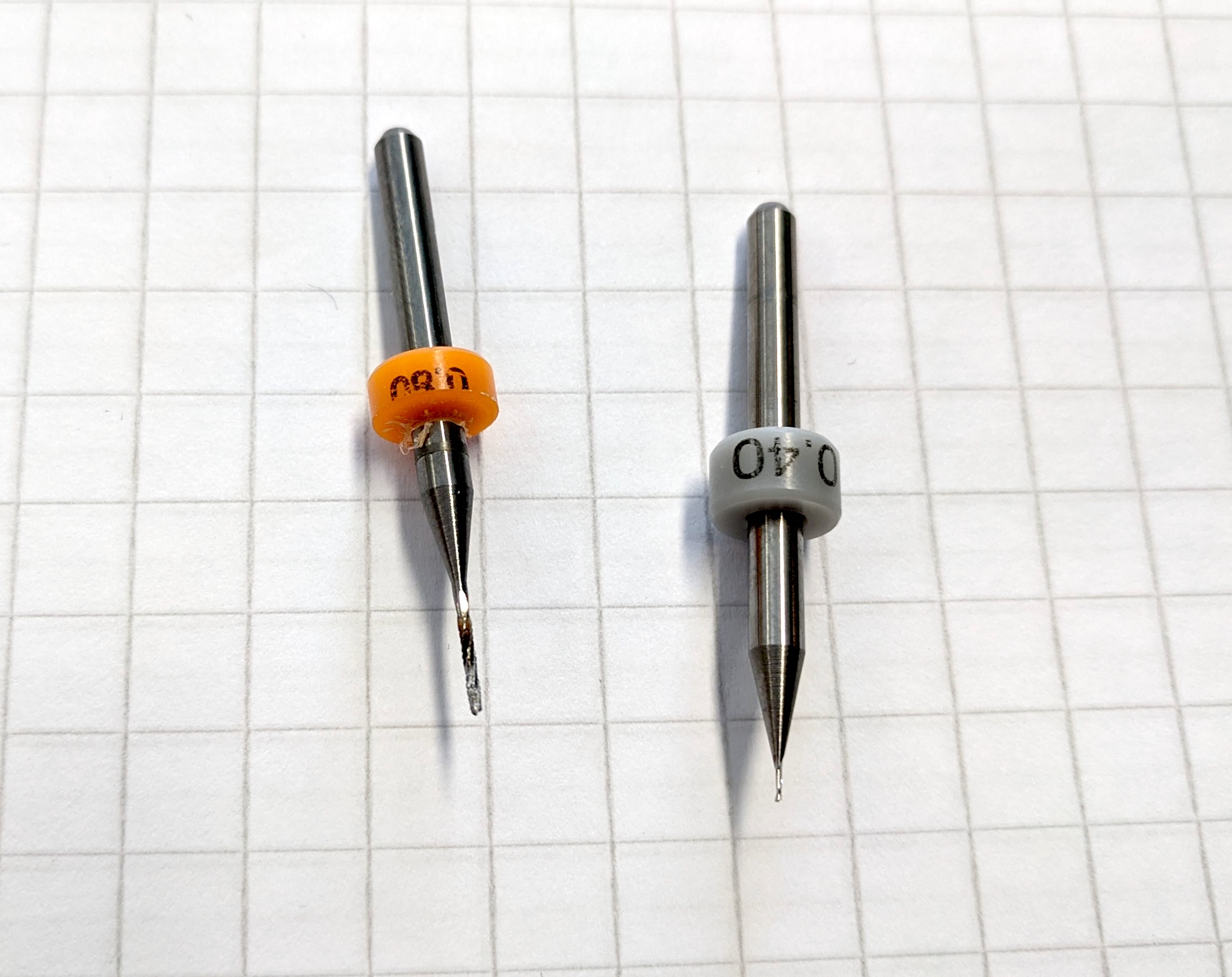 0.8mm and 0.4mm tools. The smaller is for engraving around the traces, and the larger is for cutting the edges.