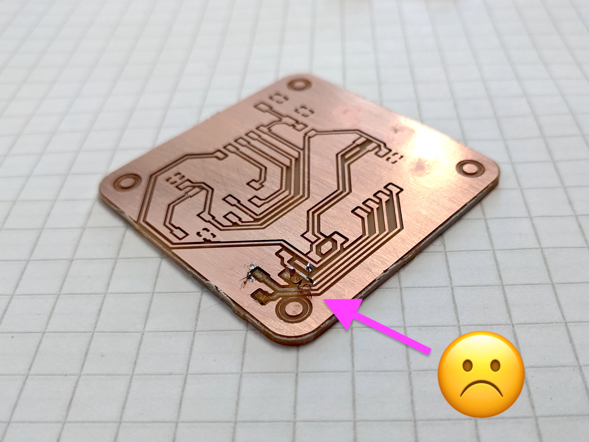 While soldering the first part, I made a bridge from the tab to the ground. I tried to remove it with copper braid, but I ended up pulling up the traces. Frustrating.