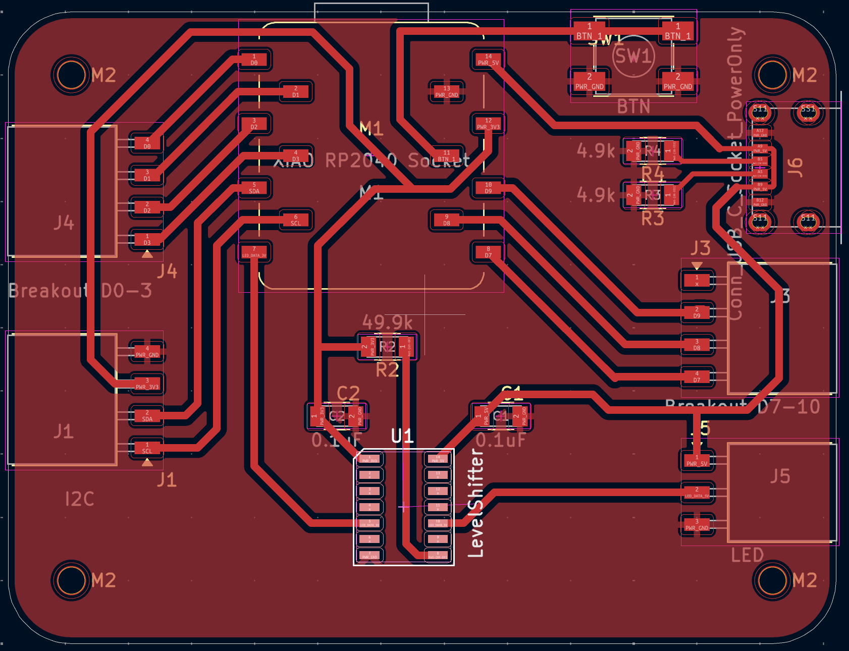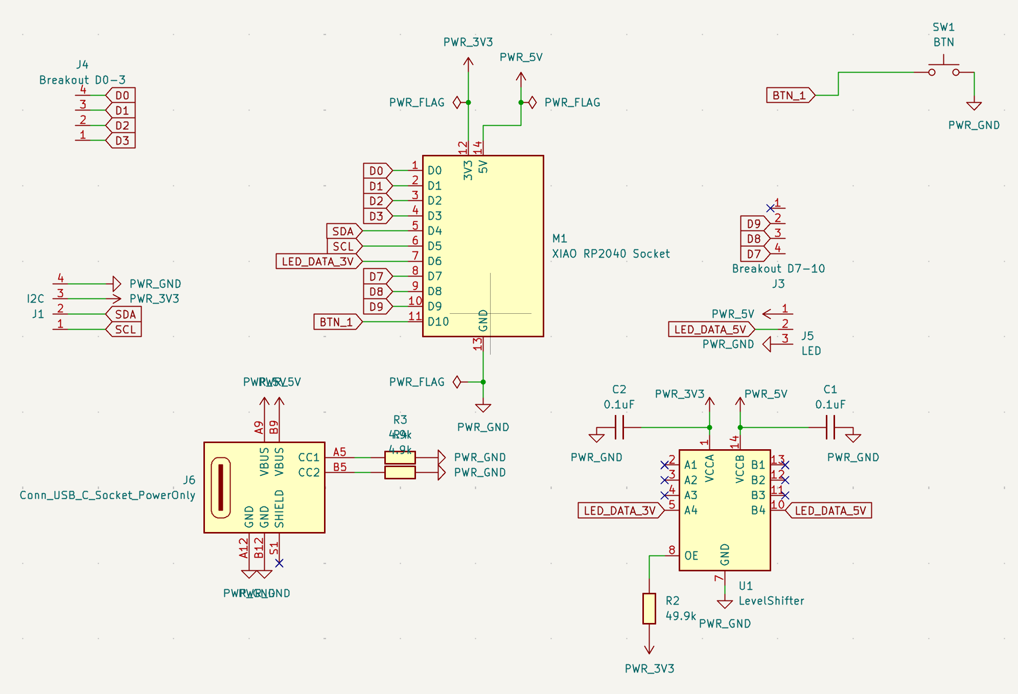 Since the XIAO RP2040 data pins have 3.3v and the LED rope data line needs 5v, I knew that my breakout board needed a level shifter. We added a LevelShifter_Texas_TXB0104DR_SOIC-14 from the fab inventory. We also added a power-only USB connector.