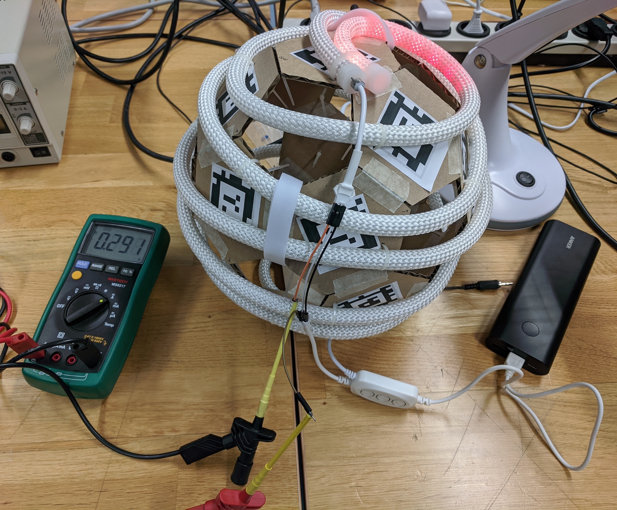 With only a some of the rope lit up, the power meter shows 0.3 amps.