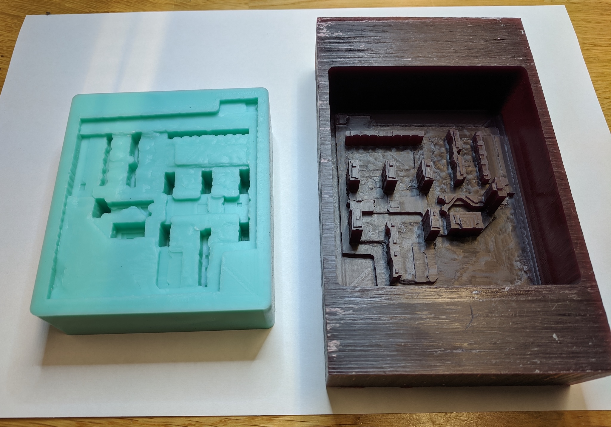 The next day, it looked and felt like a success. I pulled the edge of the silicone a little bit, and blew compressed air in to encourage it out. I was a little worried that the thin buildings might break while removing the casting, but it came out without issue.