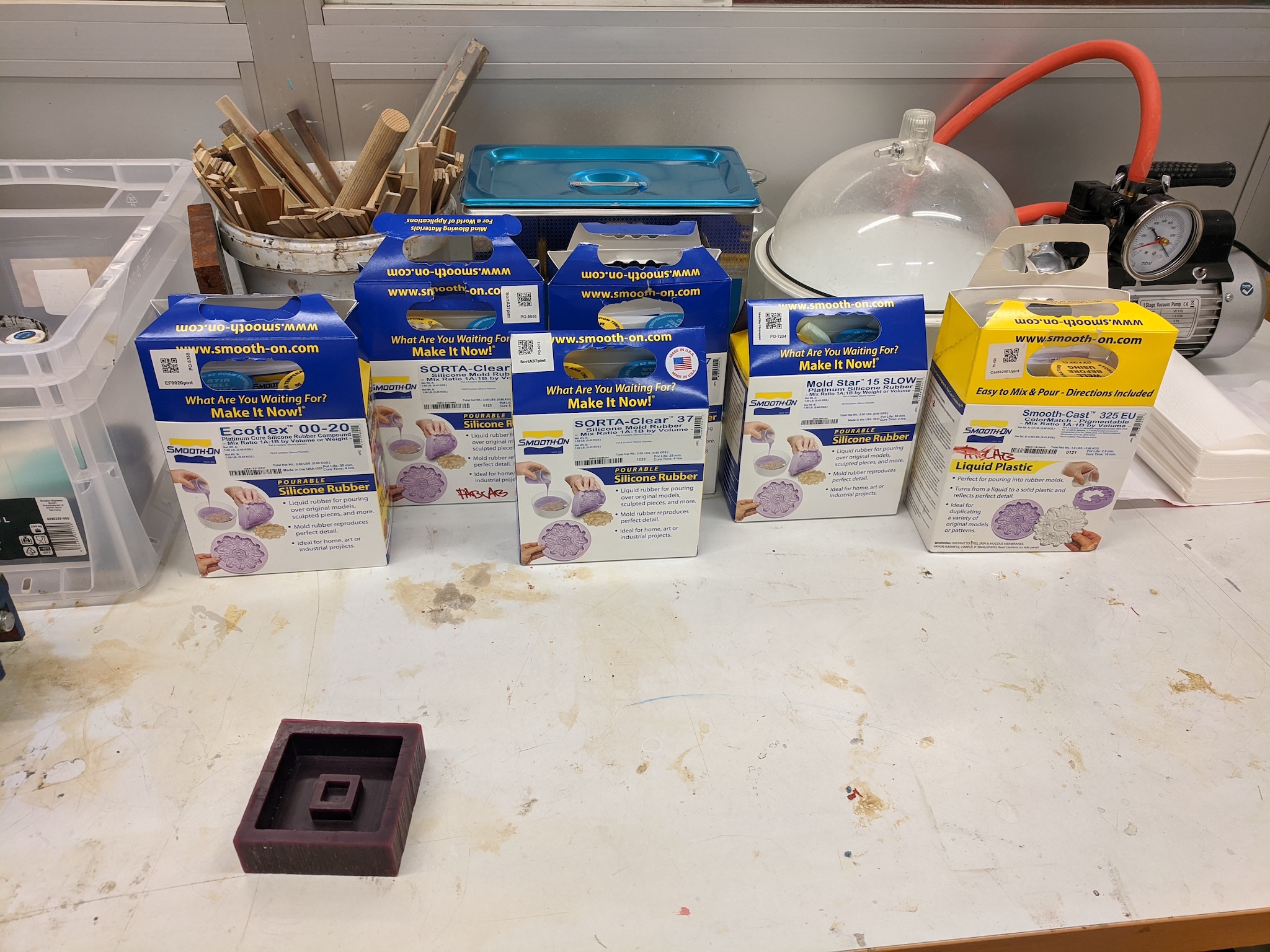 Wooden stirring sticks, vacuum chamber, and Smooth-On molding and casting supplies in the molding and casting room at Aalto Studios.