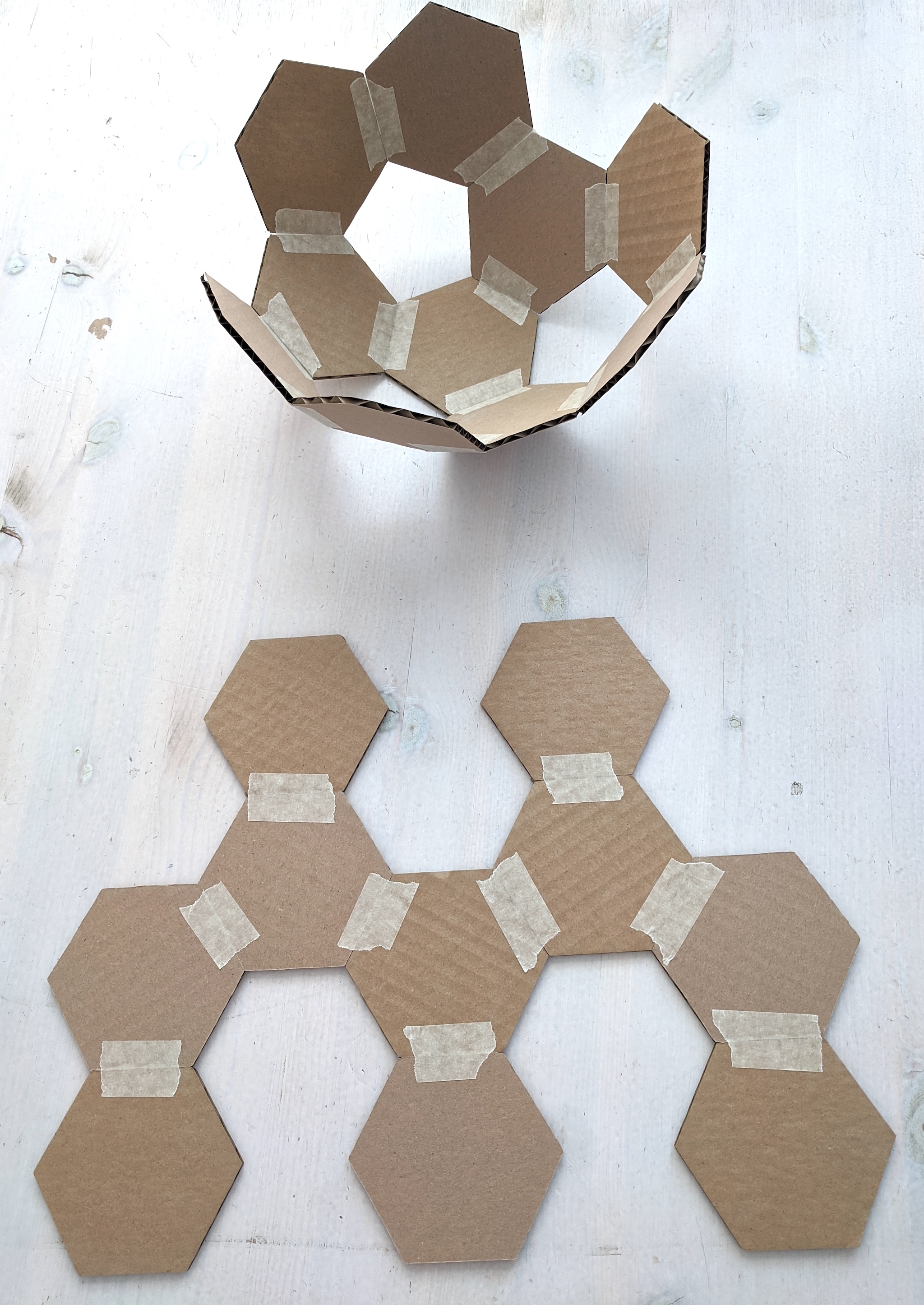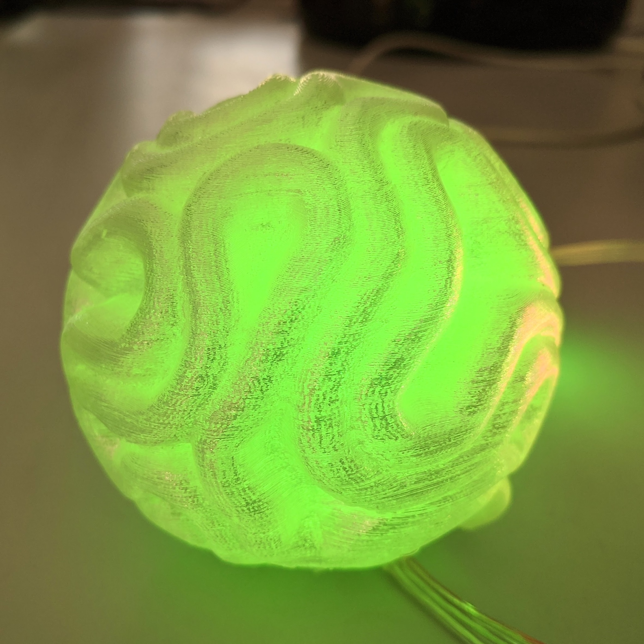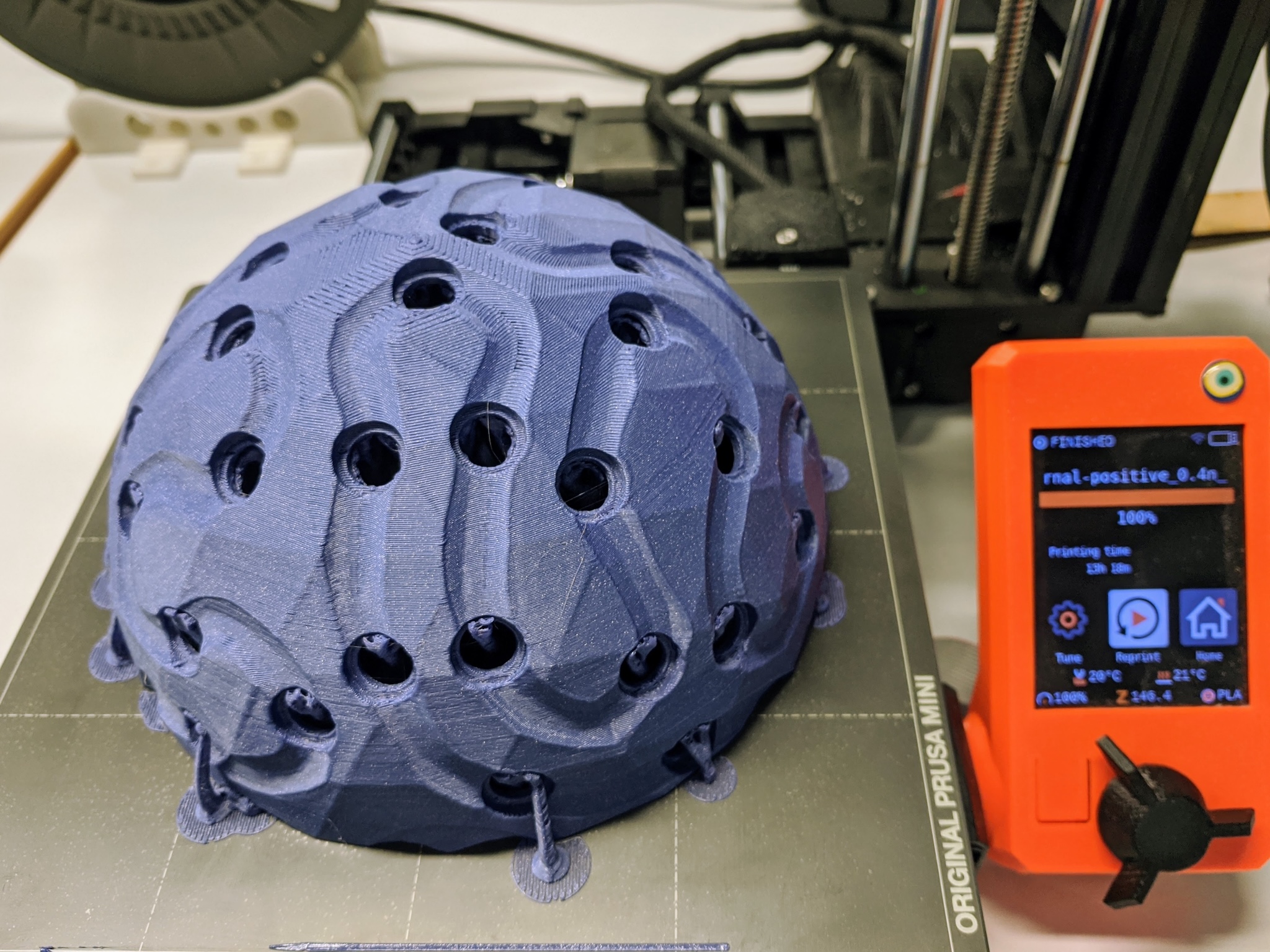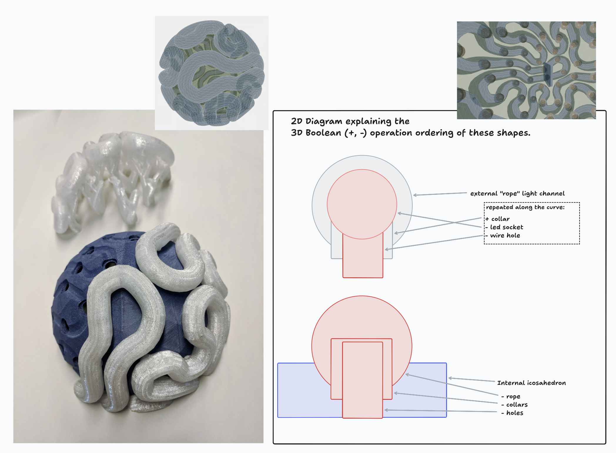 - Once the path is solved, sockets for the LED wires are added, and holes are subtracted, using Boolean operations. The sockets are oriented towards the center of the ball.