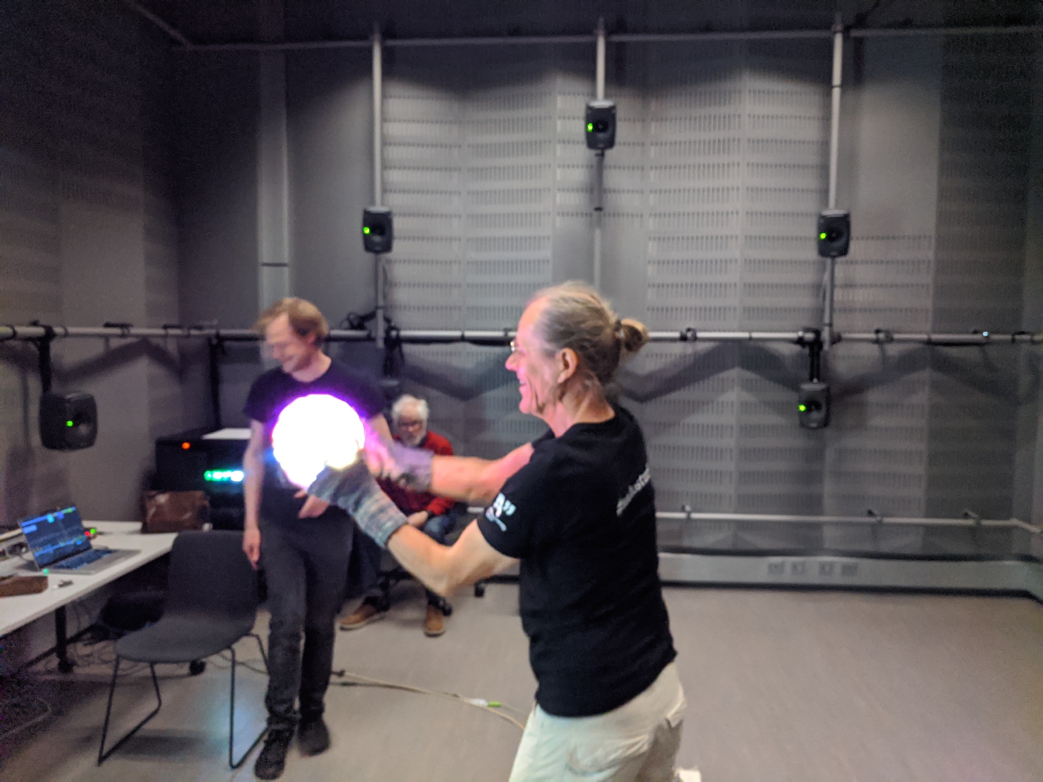 At demo day. Playful spontanious combination with a 360° audio installation.