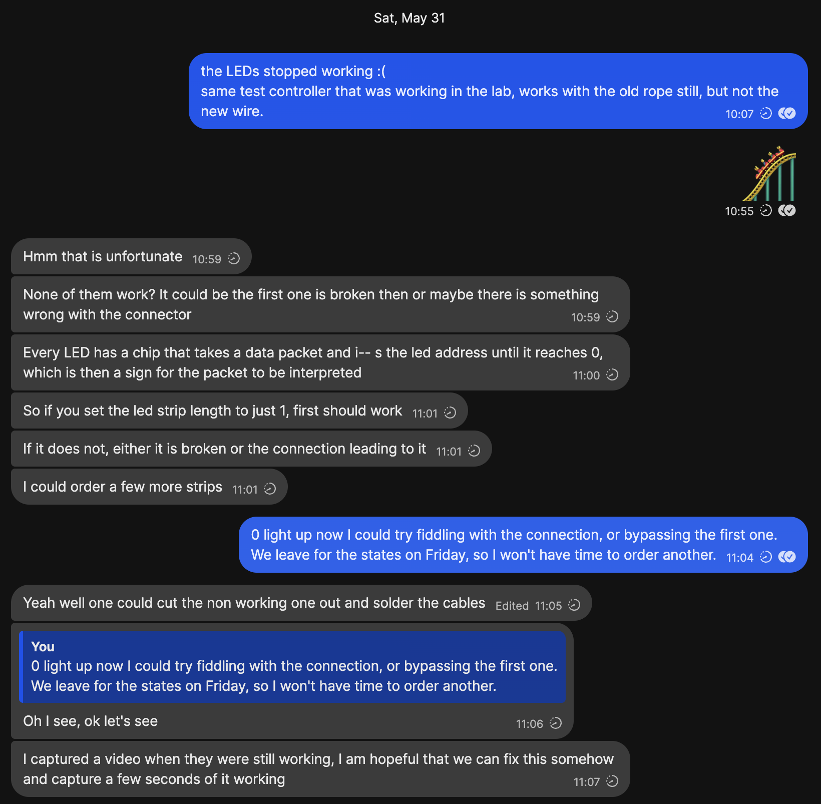 After feeling lots of momentum at the lab getting the parts produced and integrated, I took everything home to finish the integration. I was distrought when none of the LEDs worked. I tried various controllers and power supplies, and they worked with another LED strip, but not my wire. I couldn't find a local source of the LEDs, and it would take too long to get a replacement. I thought my schedule was shot. I wouldn't be able to finish the course on time.