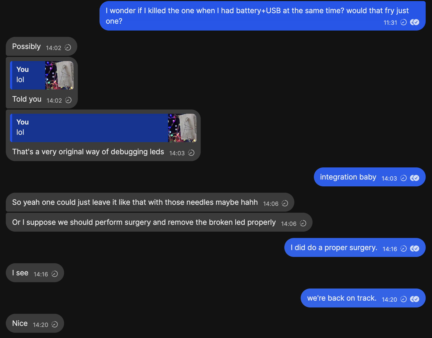See LED strip drama in the build log for something that did not work. Also the first attempt at soldering the circuit board (Week 08) did not go well.