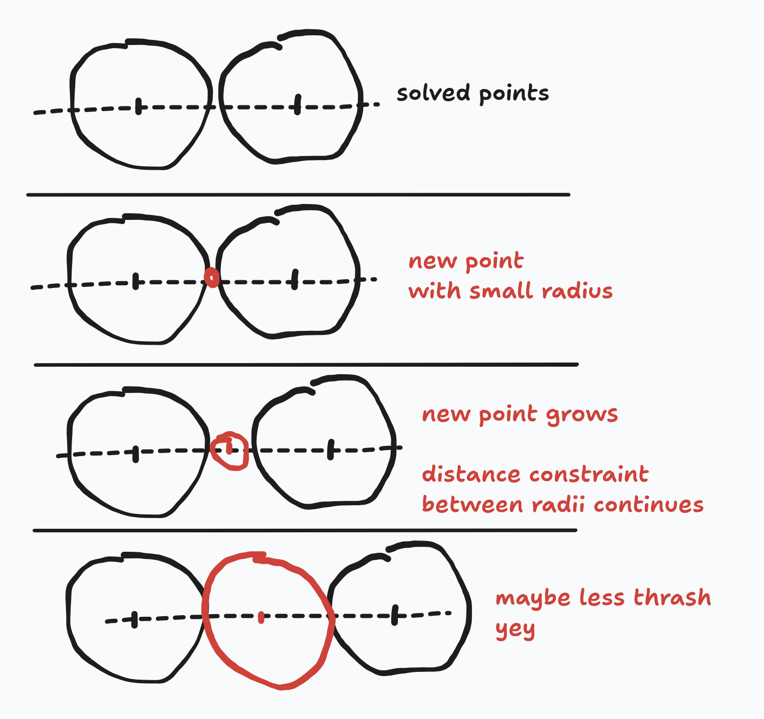 One challenge was smoothly adding beads to the rope. If you just add a new bead between two existing ones, the new bead will be overlapping, and the collision constraint will "thrash" the rope as the beads jump away from their overlap. By adding a new bead with a small radius and then smoothly growing it, the rope can grow without this thrash.