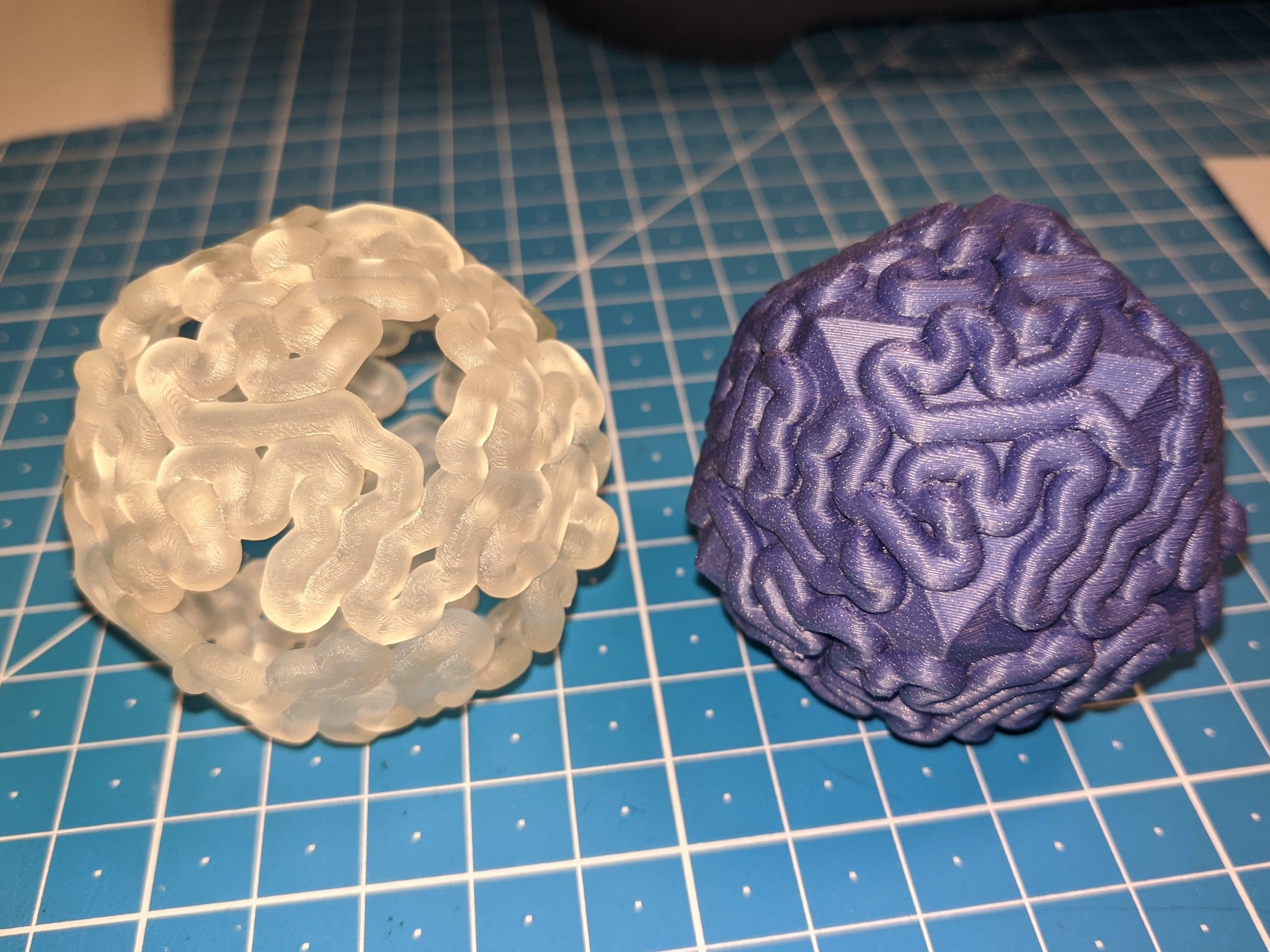 I've printed 3 versions of the same simulation result: ropes only, union with icosahedron, and difference (carving into the polyhedron). There is a pleasing contrast between the regular polyhedron and organic ropes.