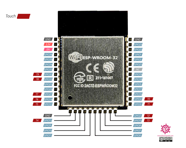 - It features a dual-core Xtensa® 32-bit LX6 processor running up to 240 MHz, with 520 KB SRAM, external flash support, and multiple connectivity options including Wi-Fi (802.11 b/g/n) and Bluetooth v4.2 (Classic + BLE). The module offers up to 34 GPIOs and supports UART, I2C, SPI, I2S, PWM, ADC (12-bit, 18 channels), DAC, and capacitive touch sensors.