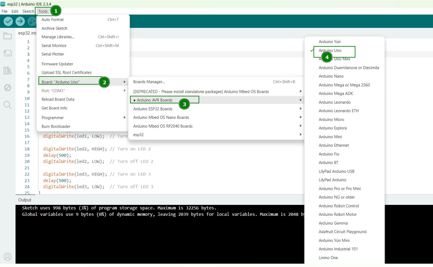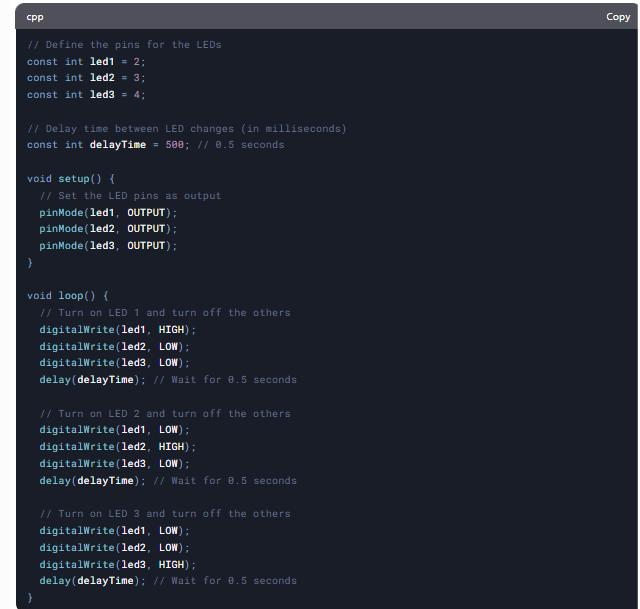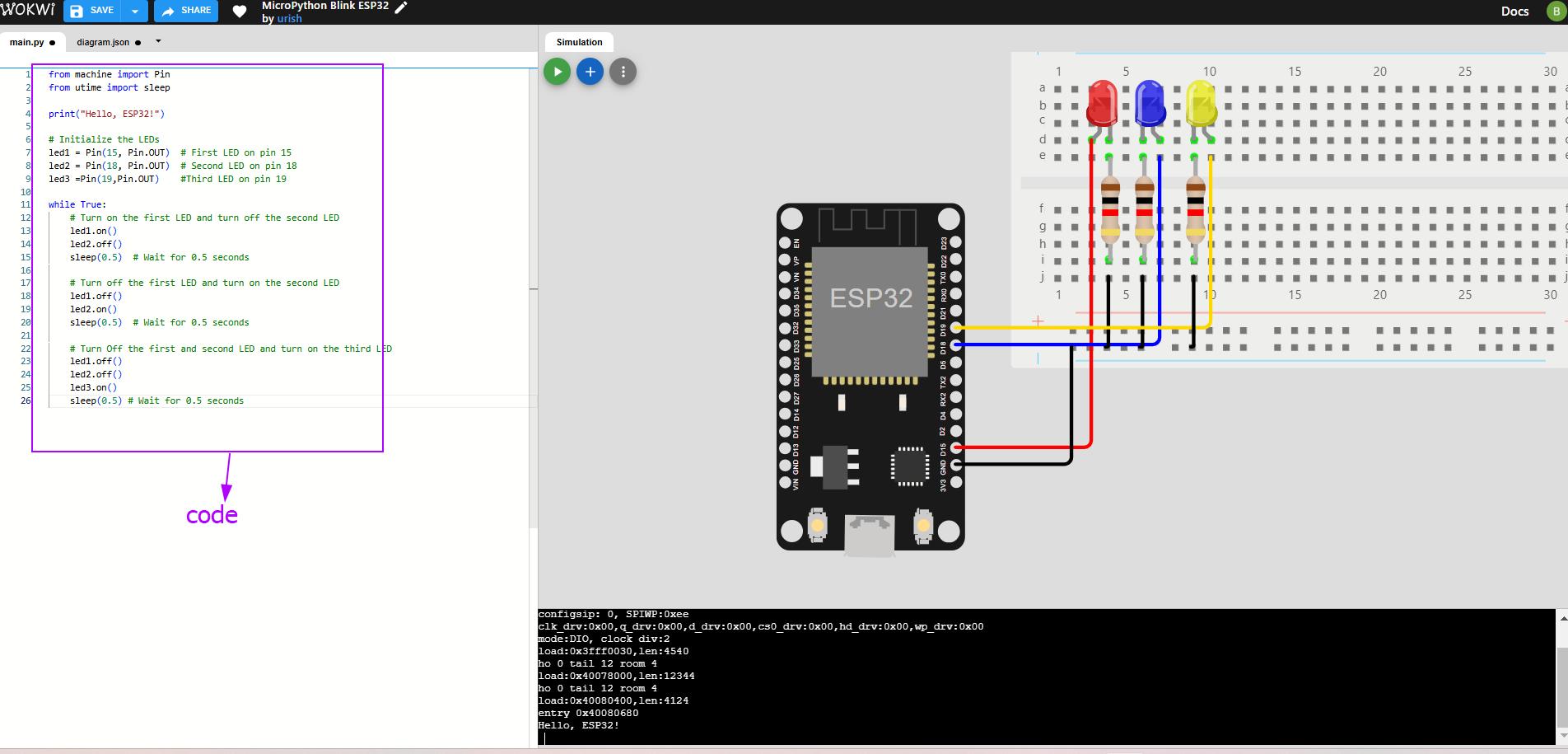 I wrote a code using Arduino IDE, this code will make three led blink one after another.Open the Arduino IDE After compiling the code, I uploaded it to the Arduino Uno board.Since I already did simulation using ESP32 in wowki.I just made few changes in the arduino code by changing the pin and adding on serial monitor.